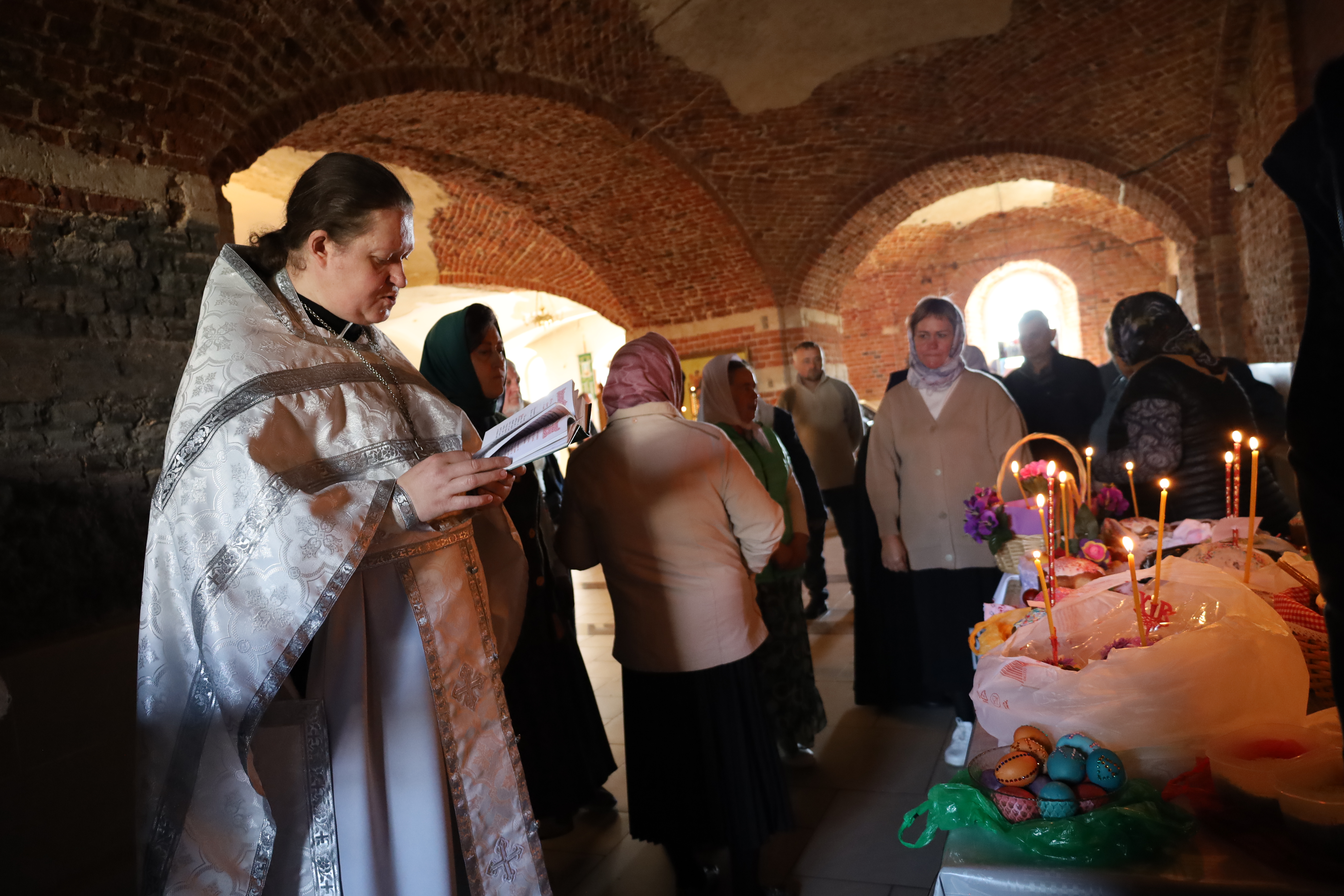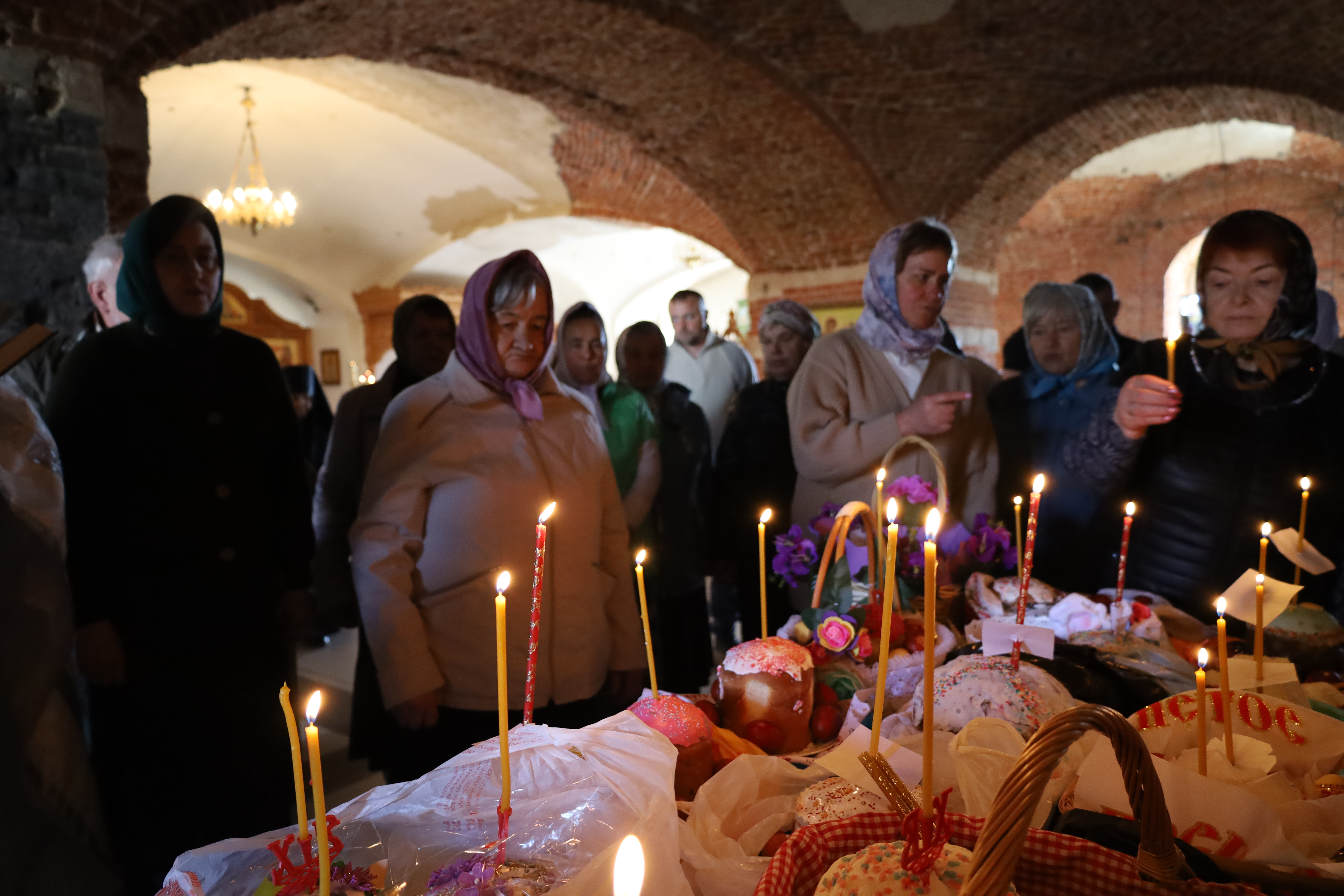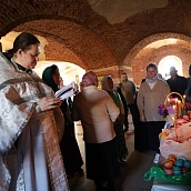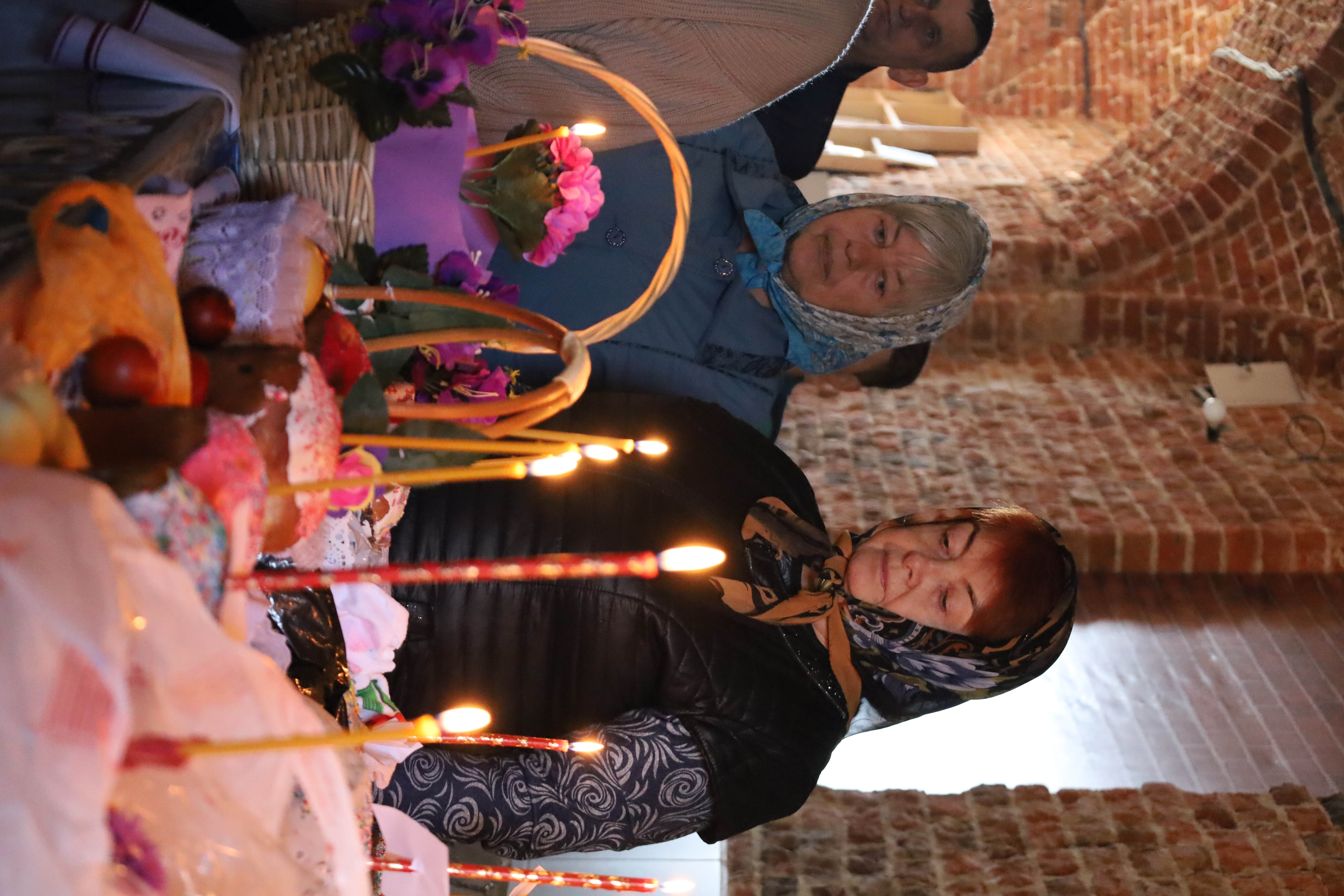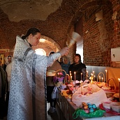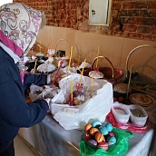 По окончании богослужения иерей Артемий благословил пасхальную трапезу прихожан — куличи, пасхи, крашеные яйца.