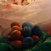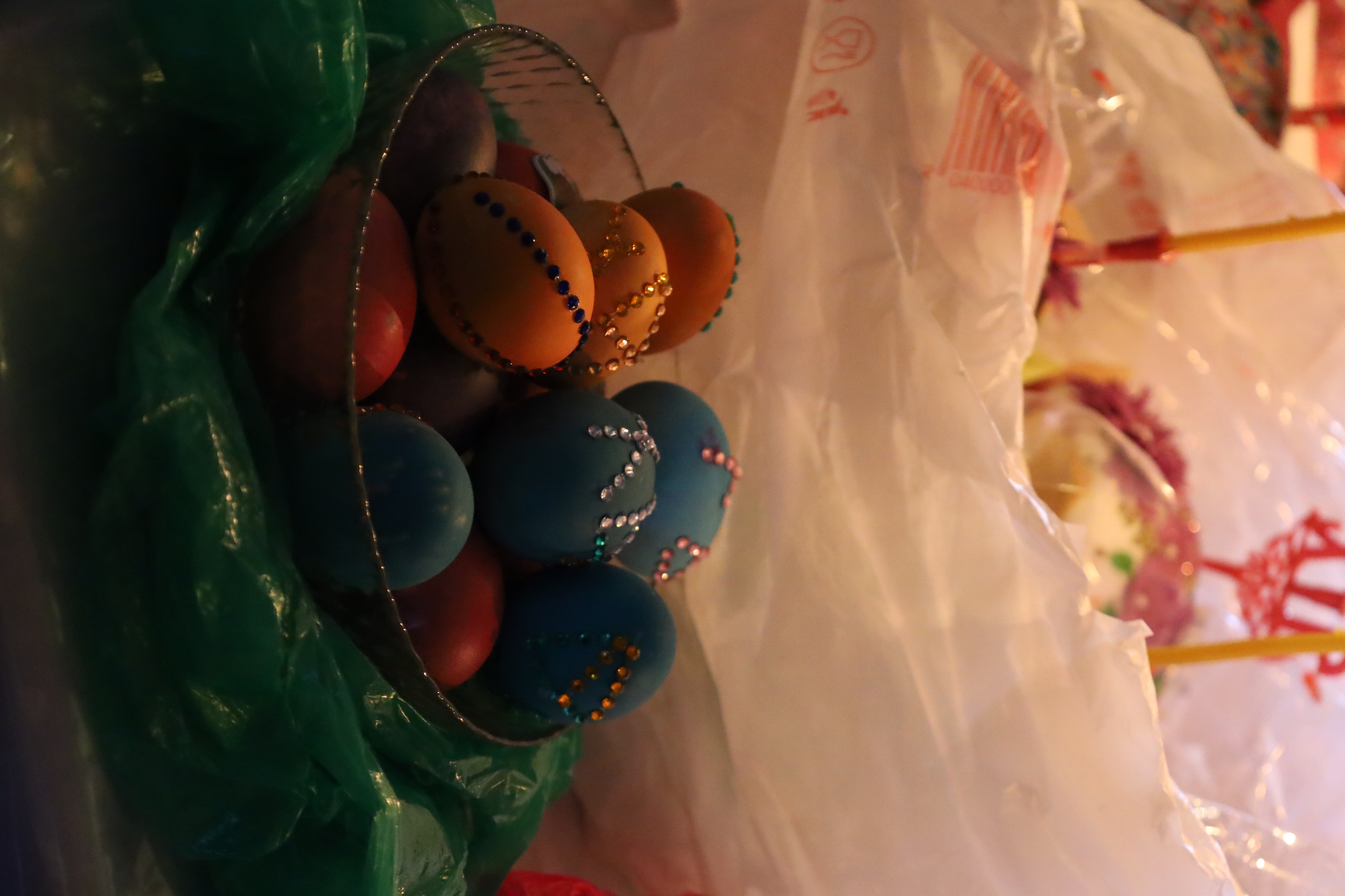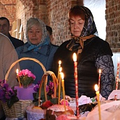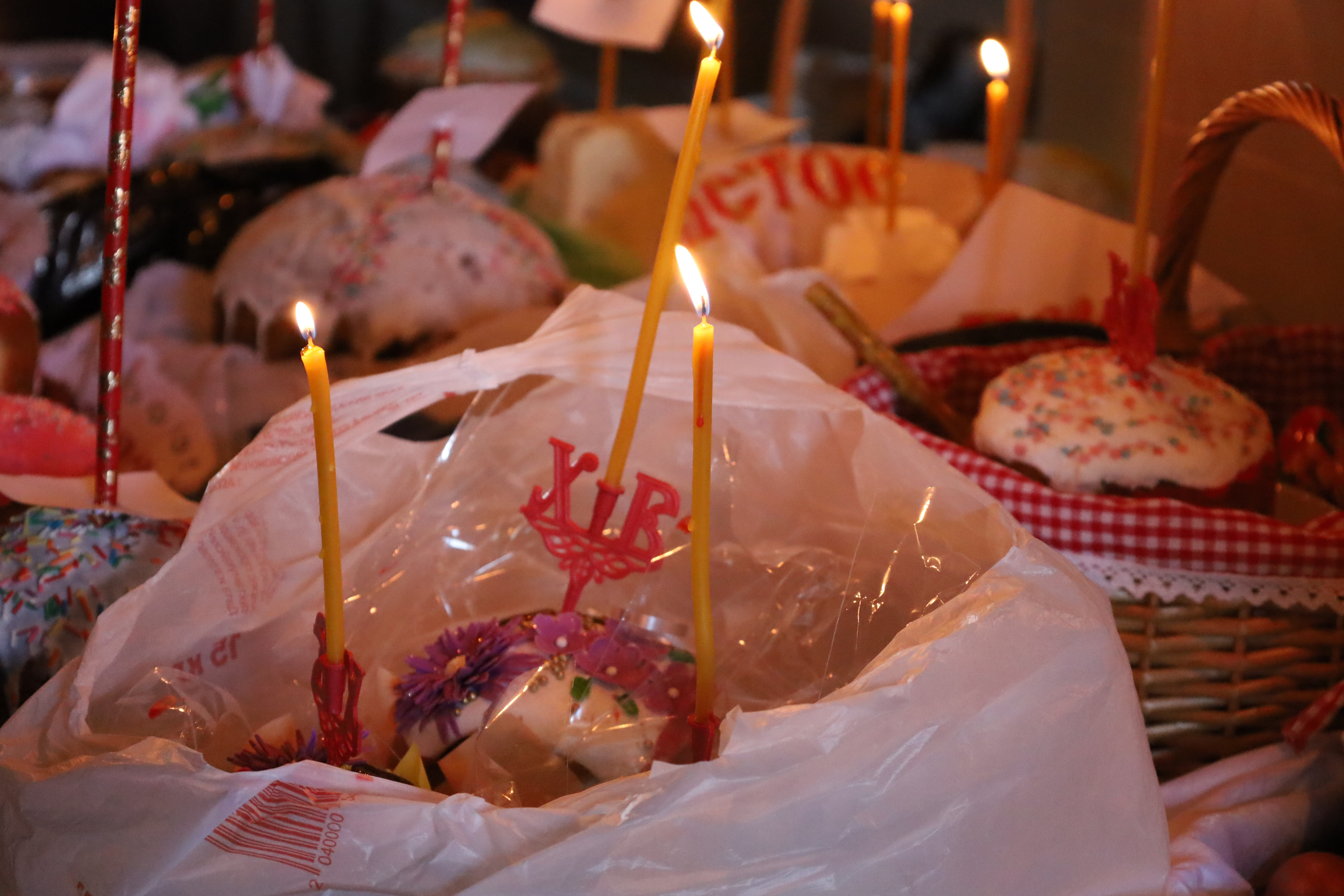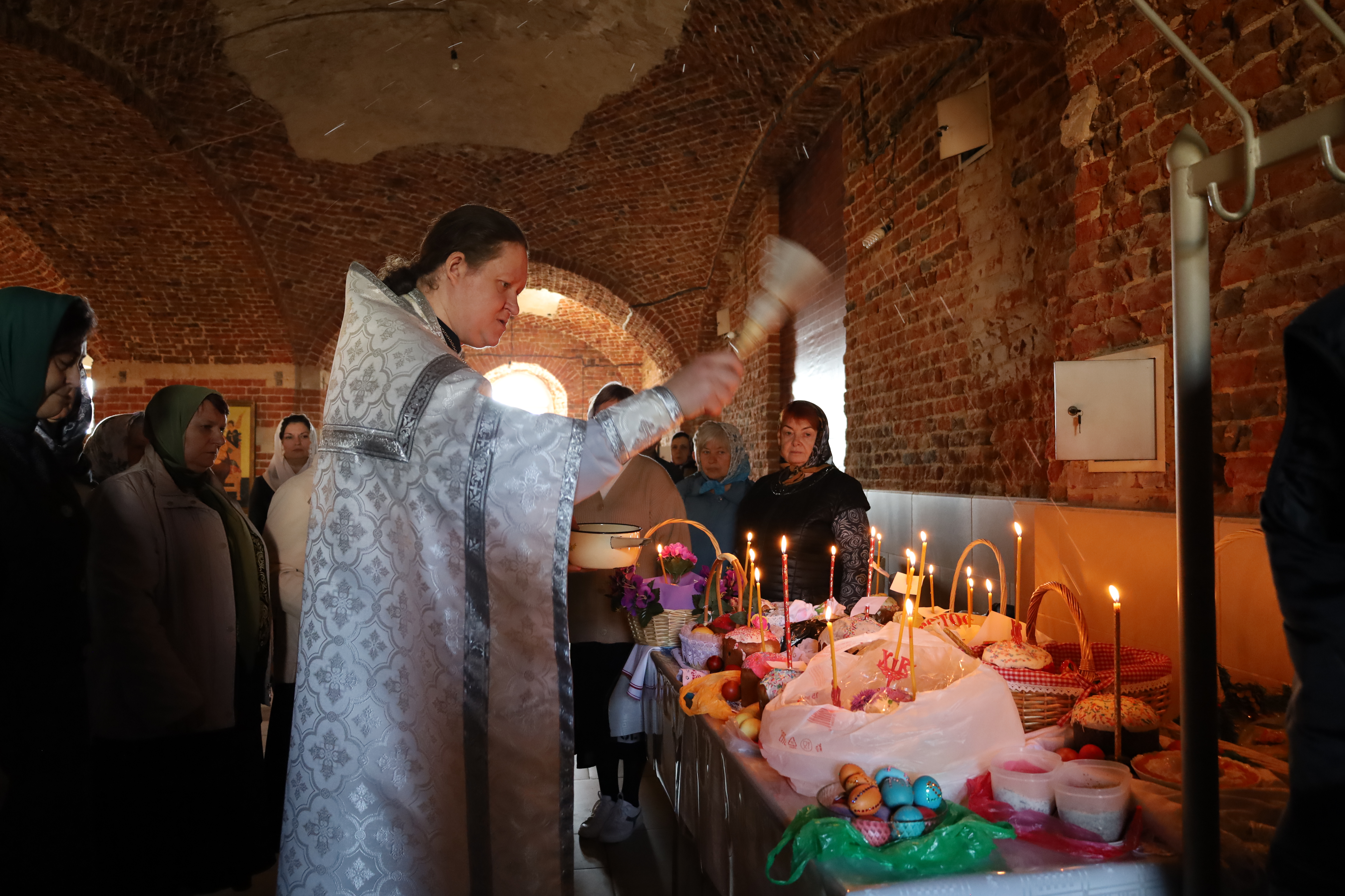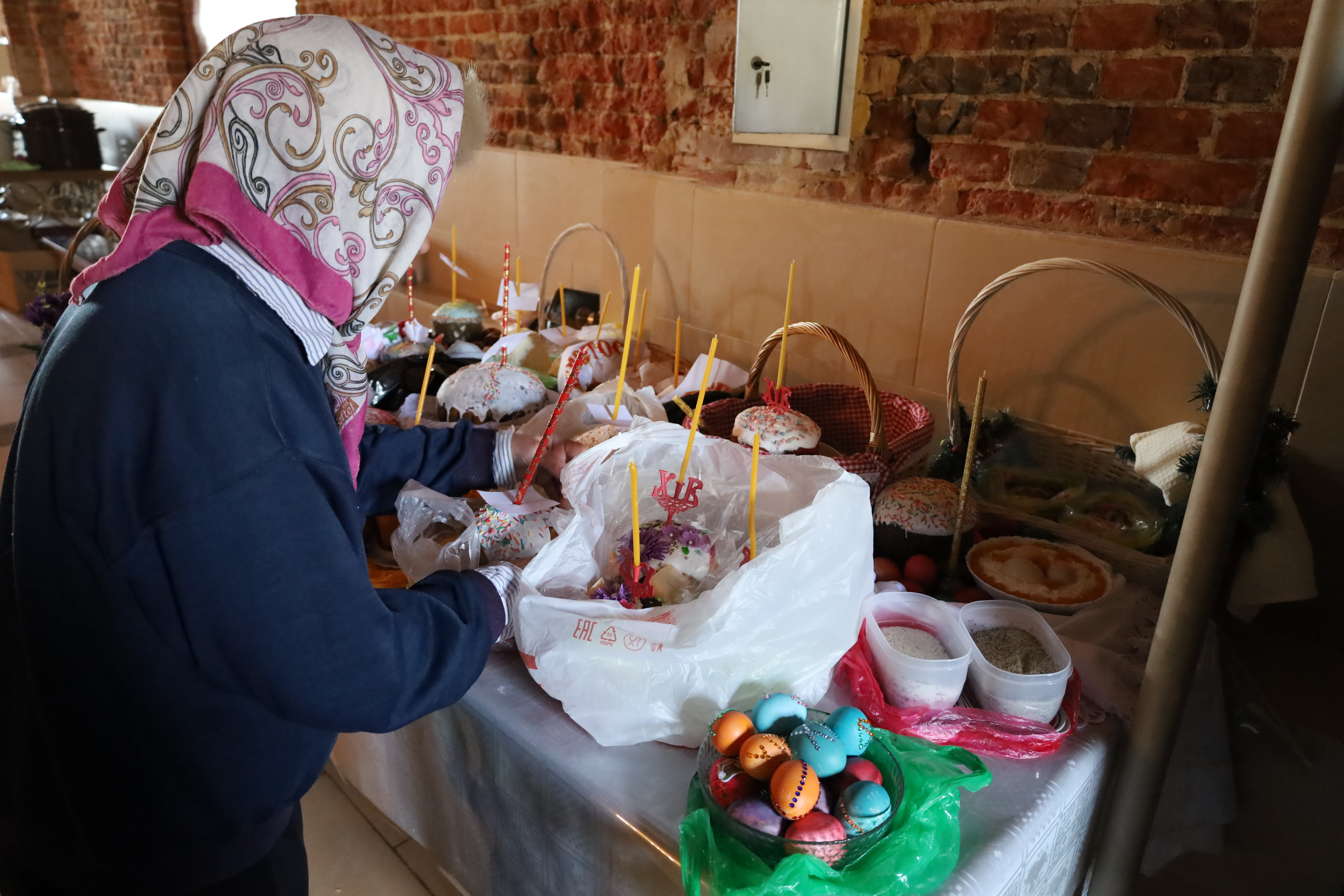 По окончании богослужения иерей Артемий благословил пасхальную трапезу прихожан — куличи, пасхи, крашеные яйца.