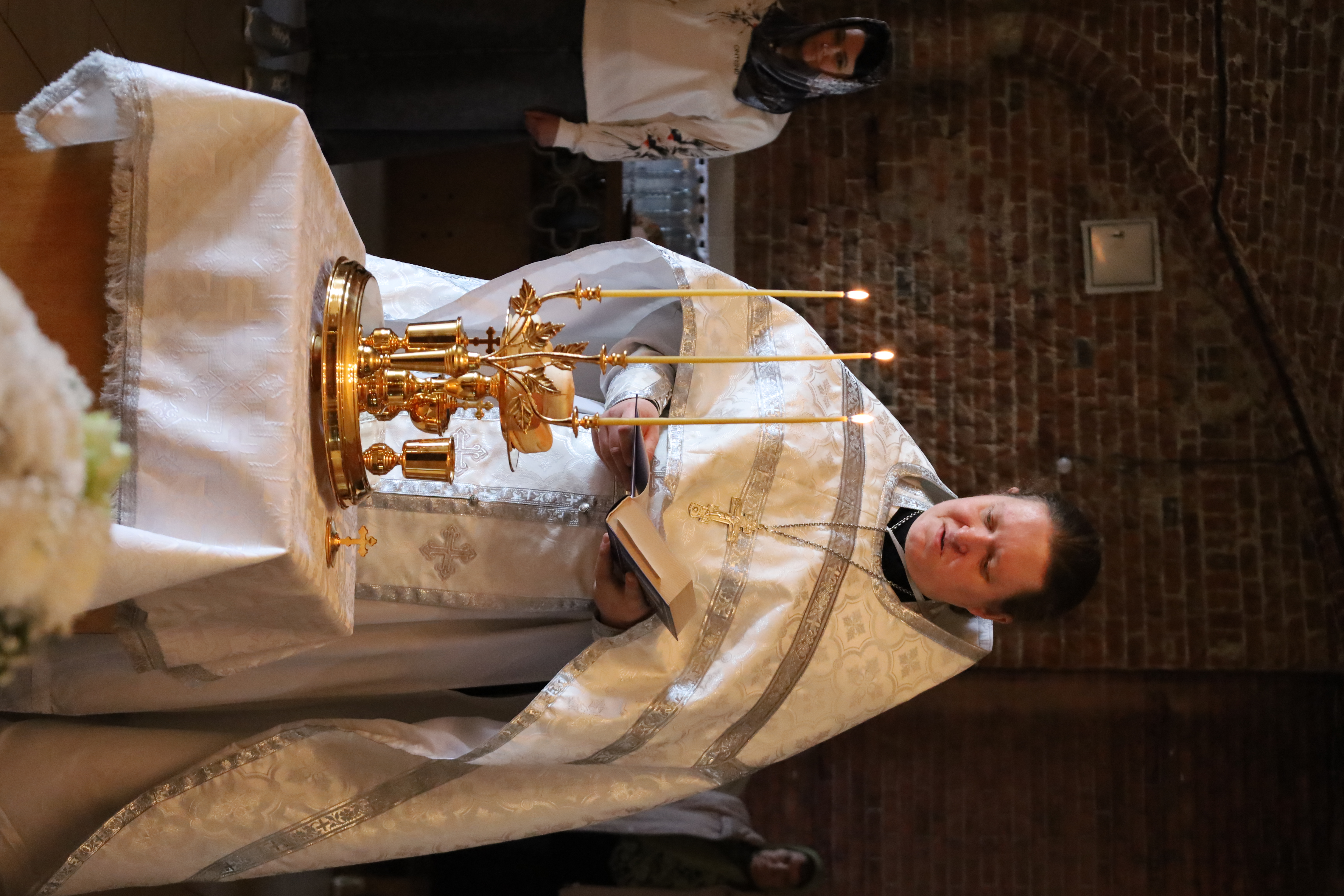 Черные облачения священнослужителей сменяются на белые в знак того, что Господь Своим Светом преодолел всякую тьму.