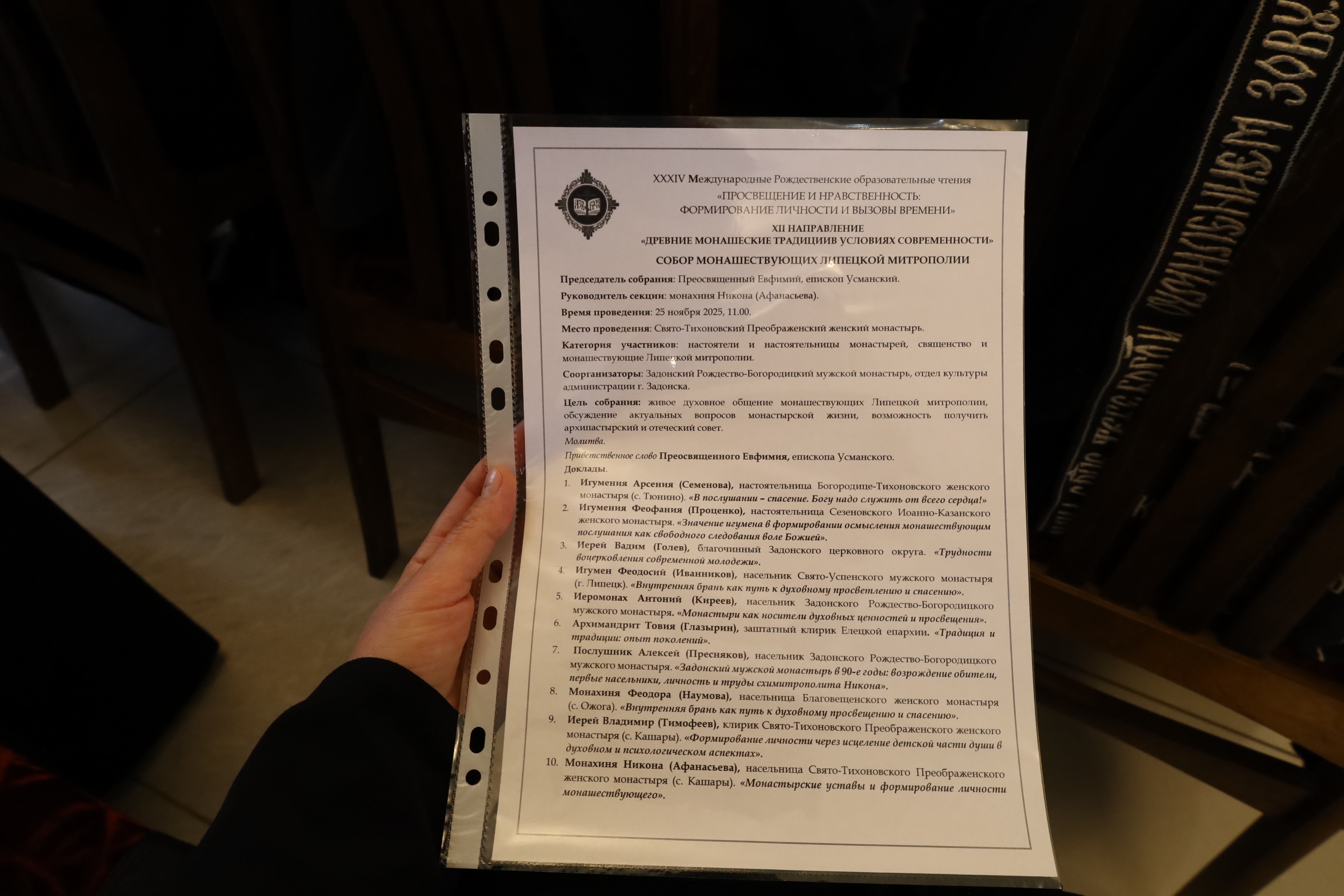25 ноября 2025 года по благословению митрополита Задонского и Липецкого Арсения, в рамках проведения XXXIV Международных Рождественских образовательных чтений «Просвещение и нравственность: формирование личности и вызовы времени» в Свято-Тихоновском Преображенском женском монастыре (с. Кашары), было проведено заседание регионального этапа монашеского направления Рождественских чтений «Древние монашеские традиции в условиях современности».