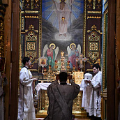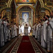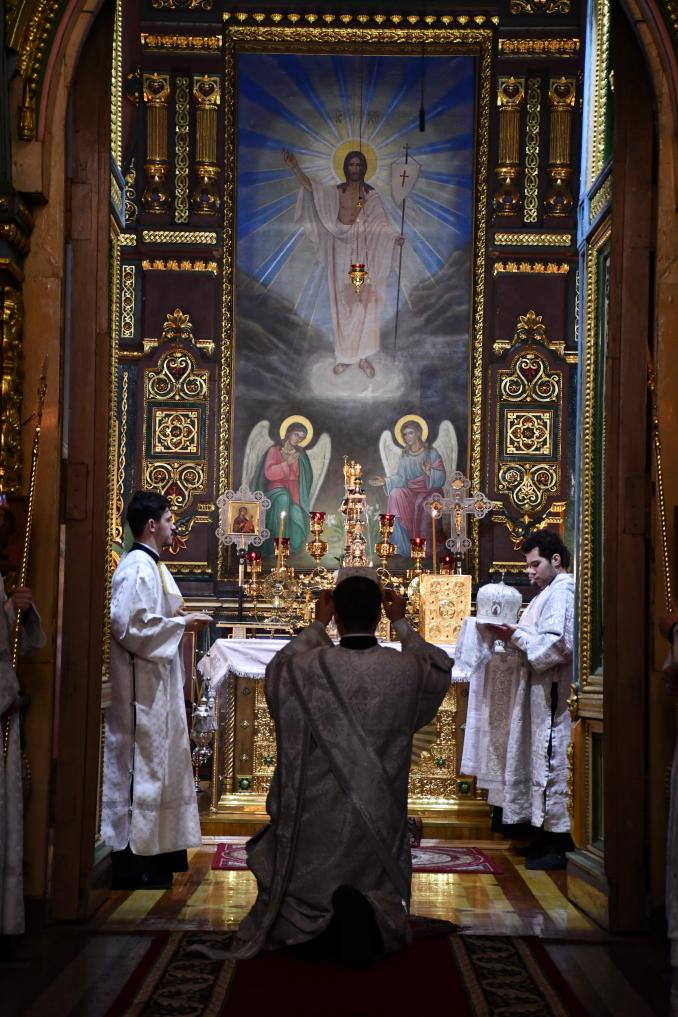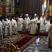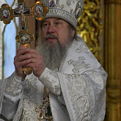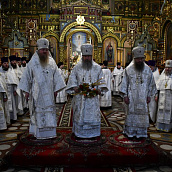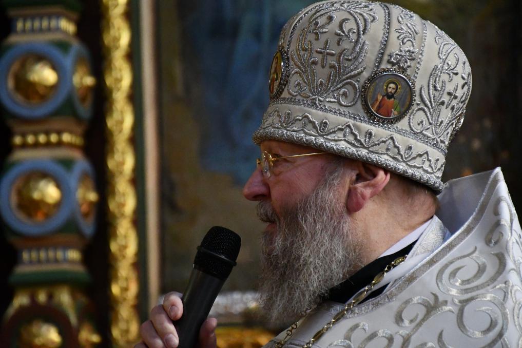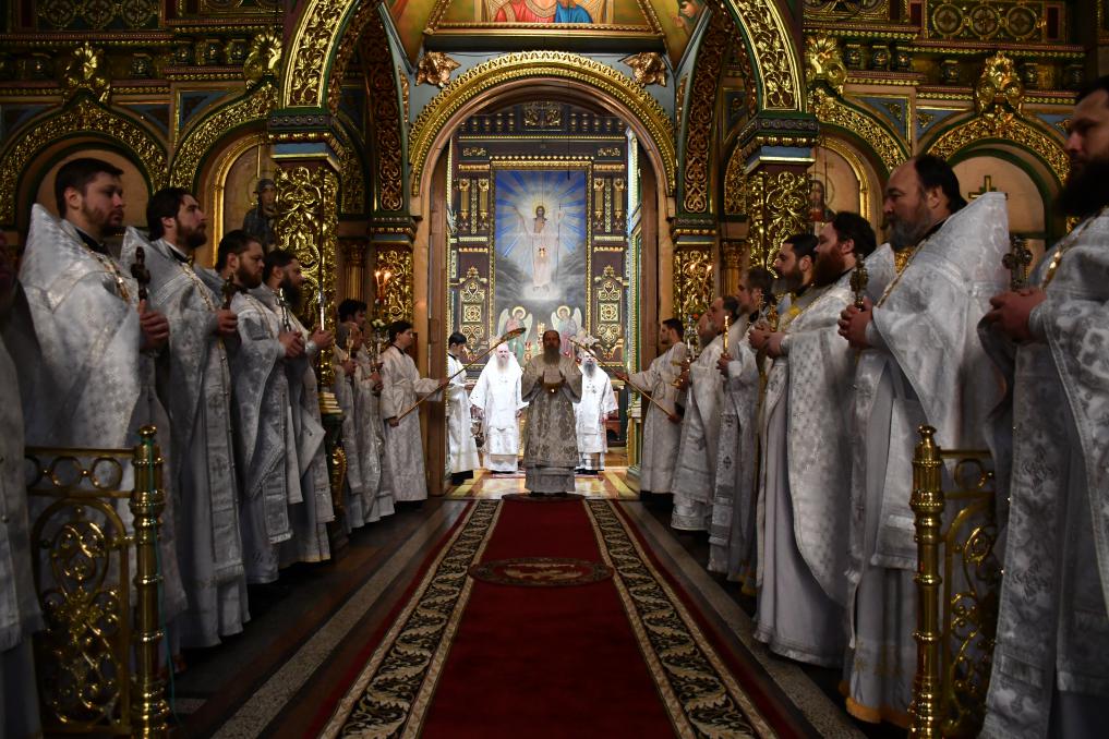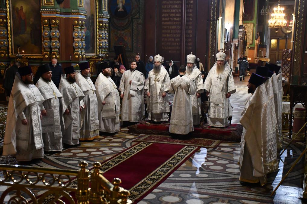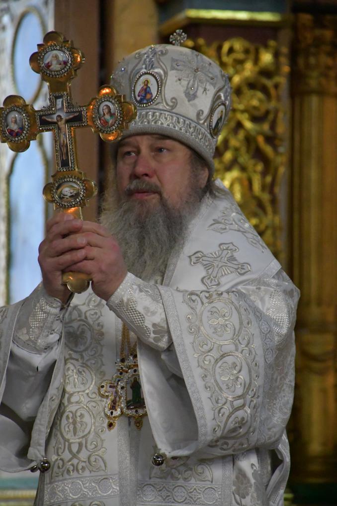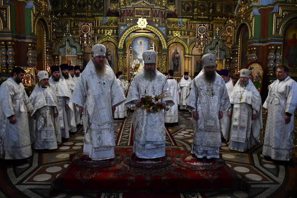На сугубой ектении диакон вознес особые прошения о сохранении единства Православия, затем владыка Евфимий сотворил молитву о мире на Украине, а владыка Гермоген — молитву во время распространения вредоносного поветрия.