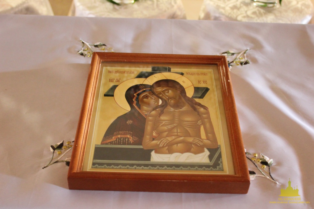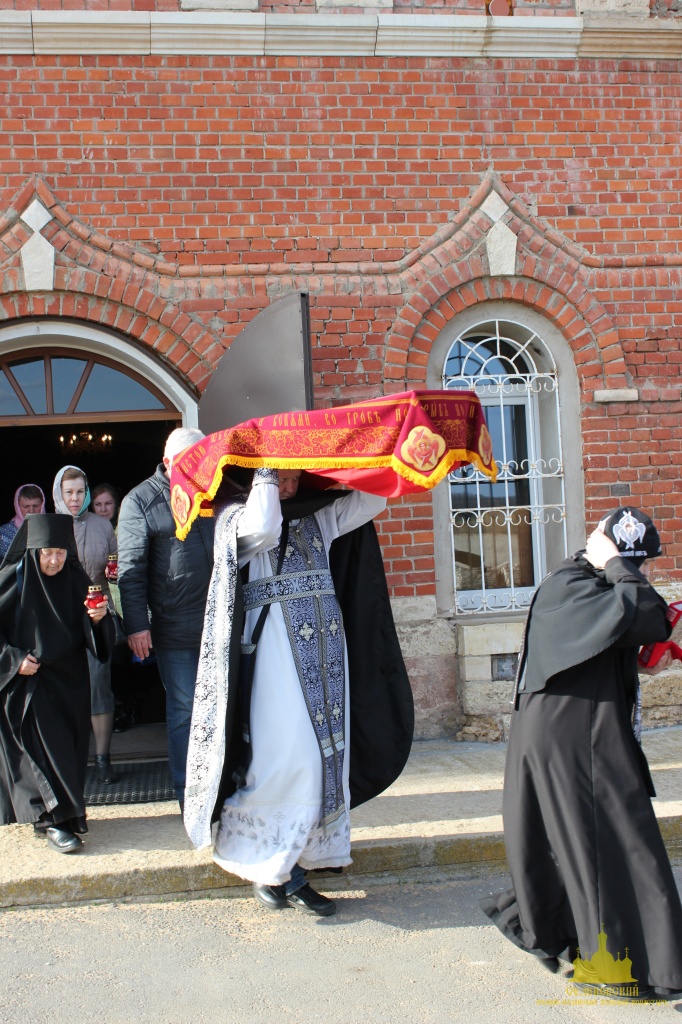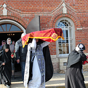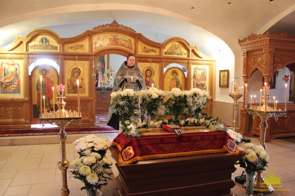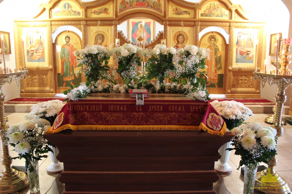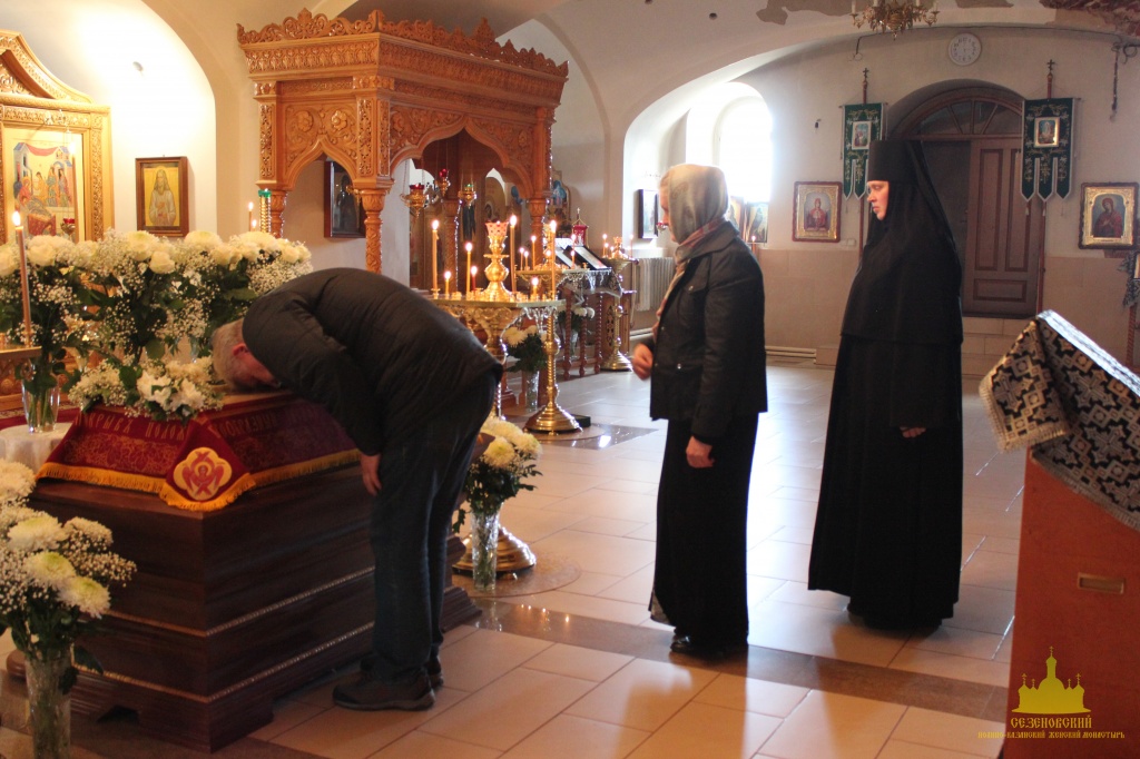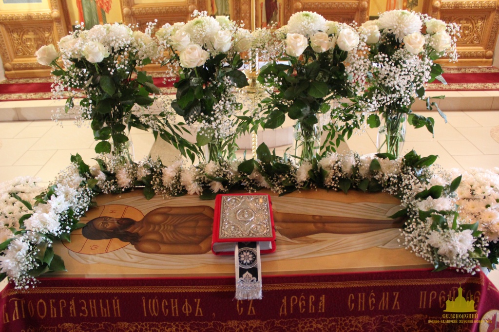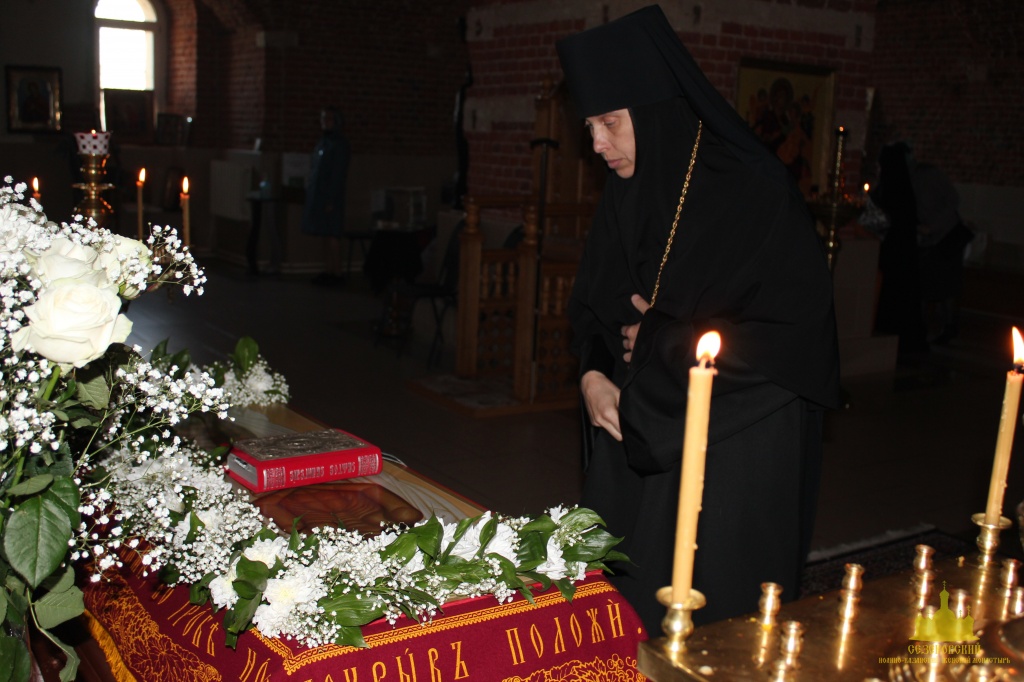 По окончании канона, при пении умилительной стихиры "Приидите, ублажим Иосифа приснопамятного" священник, Матушка игумения и далее все сестры и прихожане приложились к Плащанице Спасителя.