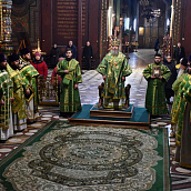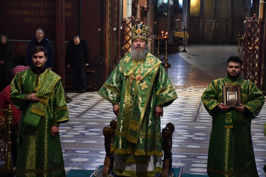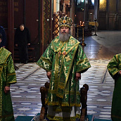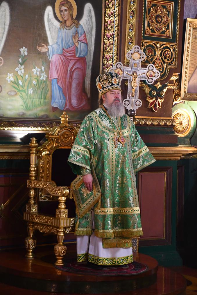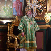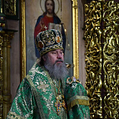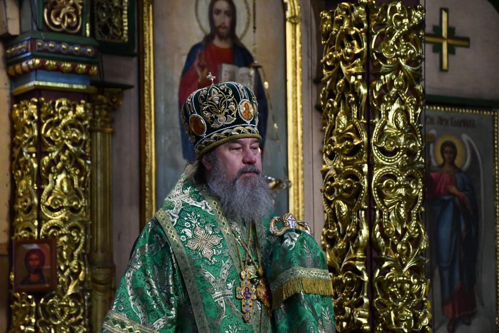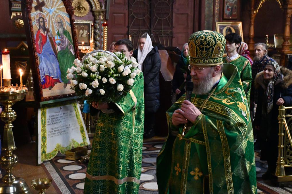 На сугубой ектении диакон вознес особые прошения о Святой Руси и прошение о ныне тезоименитом епископе Максиме, затем Владыка вознес молитву о Святой Руси.