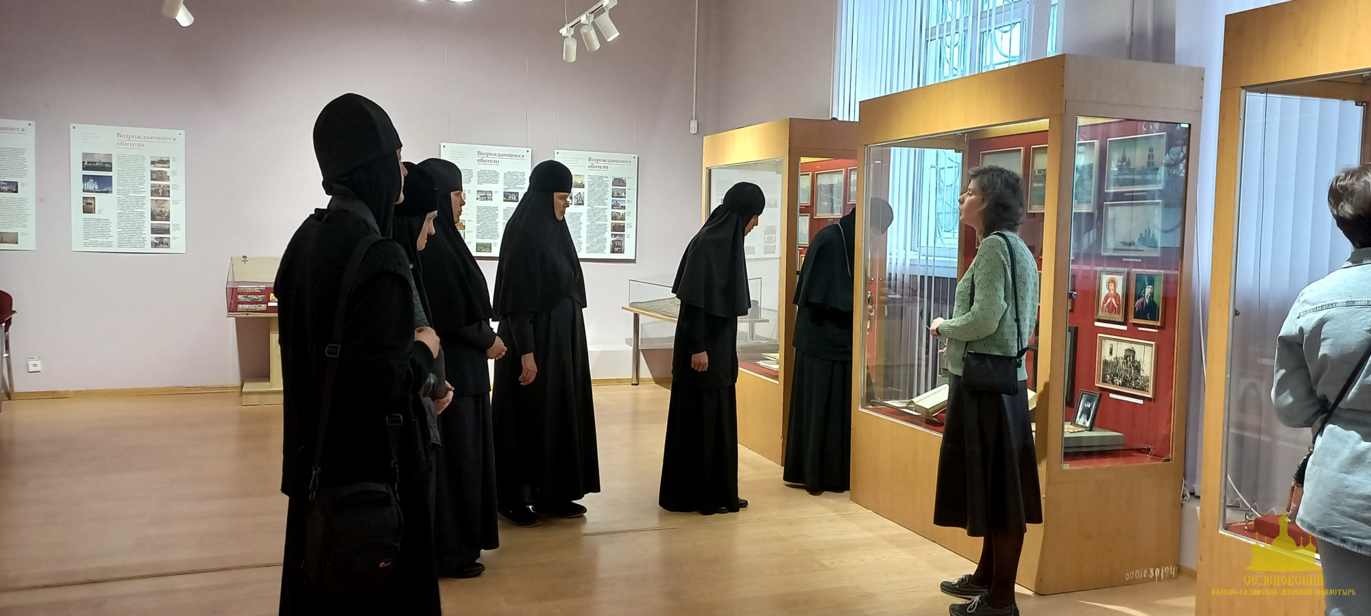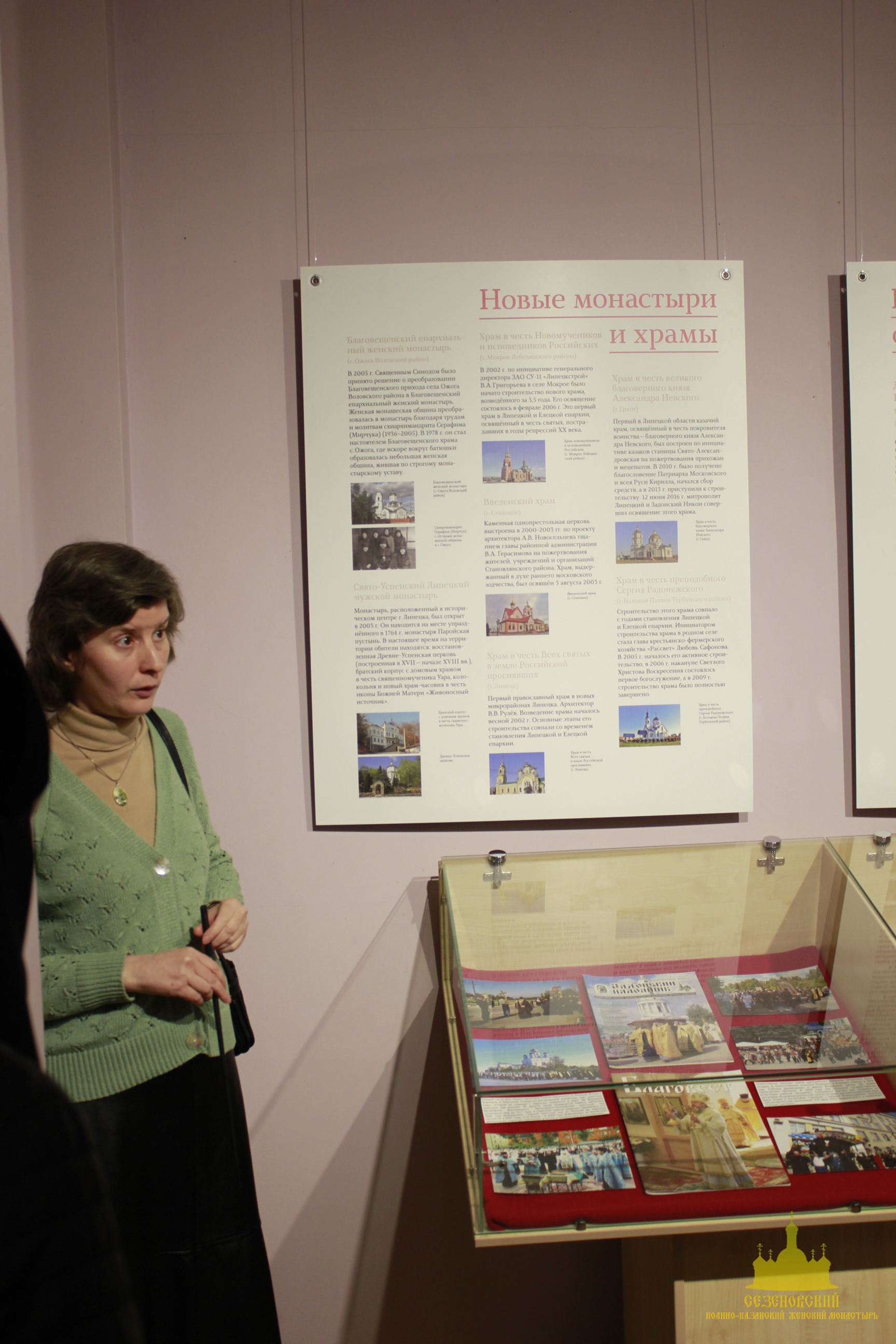 Анжелика Вячеславовна Юнченко, научный сотрудник музея, организатор выставки, провела сестрам экскурсию по экспозиции выставки, состоящей из двух частей. В первой части показаны города Липецк, Елец, Задонск, Лебедянь до 1917 года. Каждому из них посвящена витрина, которая содержит изображение панорамы города, фотографии самых главных храмов и монастырей (в том числе несохранившихся); святых и подвижников благочестия, жизнь которых связана с этими городами, выставлены экспонаты, связанные с их памятью и историей.
