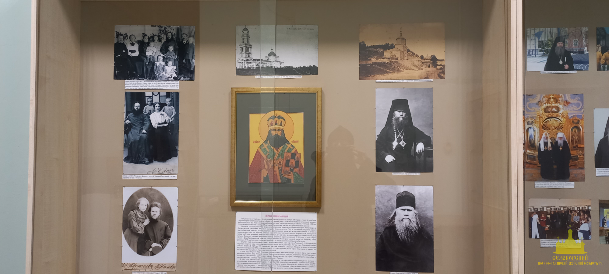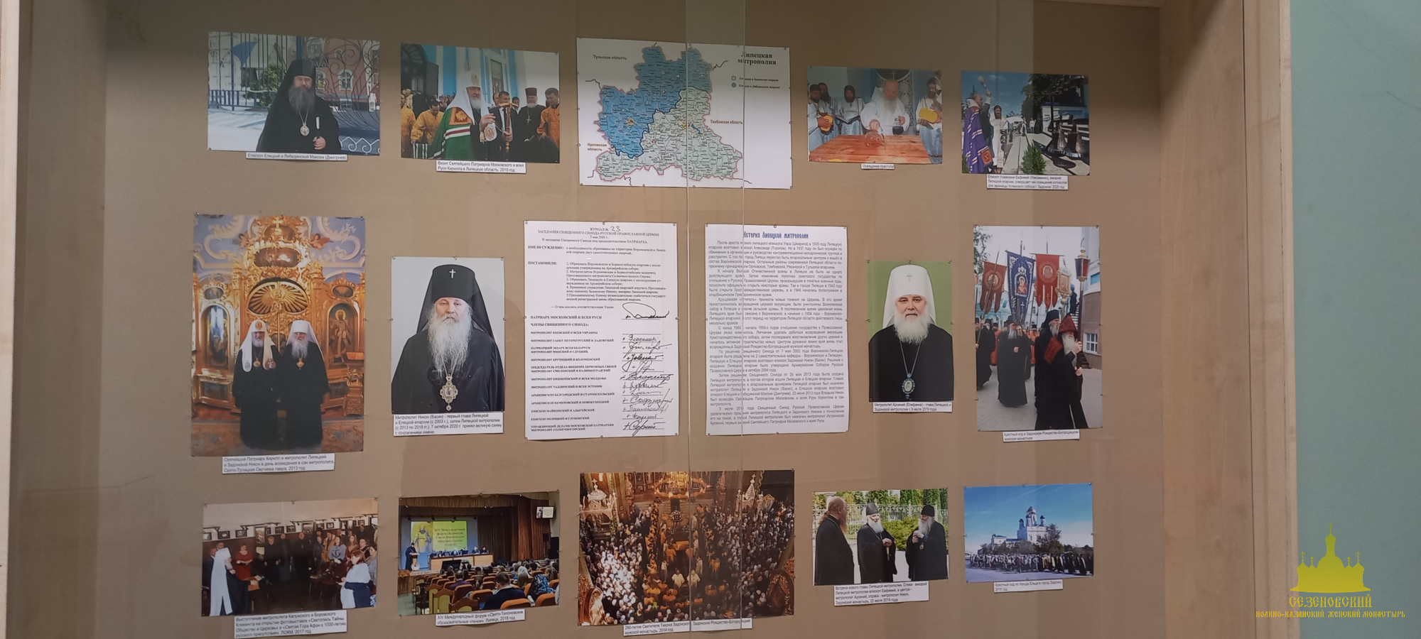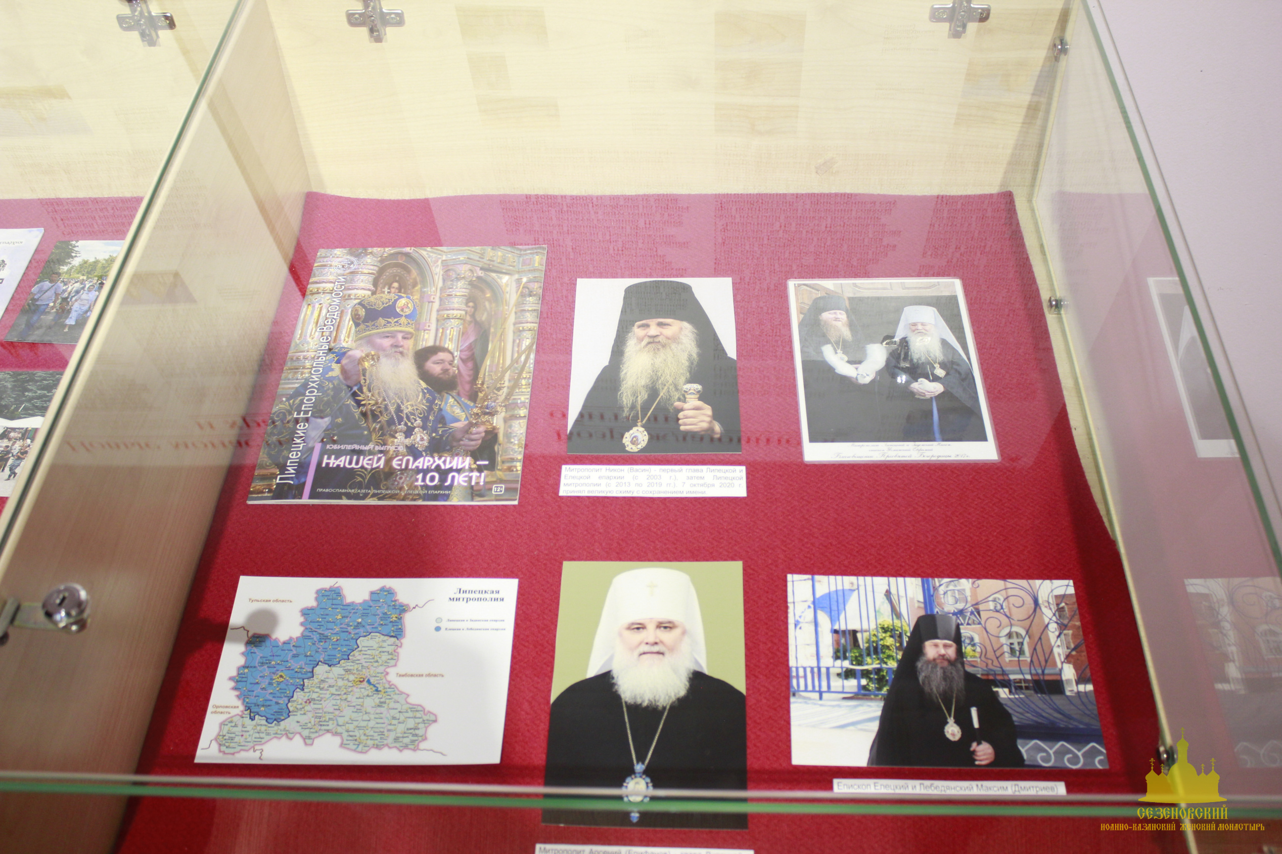 Рядом в витринах размещены фотоматериалы, повествующие о современных событиях из церковной жизни Липецкого края: посещениях Святейшими Патриархами Липецкой области; значимых церковных событиях, предшествовавших образованию самостоятельной Липецкой и Елецкой епархии (празднованию 300-летия Воронежской епархии и перенесения мощей святителя Митрофана Воронежского в кафедральный Покровский собор г. Воронежа); крестных ходах ко дню памяти святителя Тихона Задонского; участию верующих в общецерковных мероприятиях, посвященных 150-летию со дня рождения преподобного Силуана Афонского, 800-летию благоверного князя Александра Невского, 600-летию обретения мощей преподобного Сергия Радонежского.