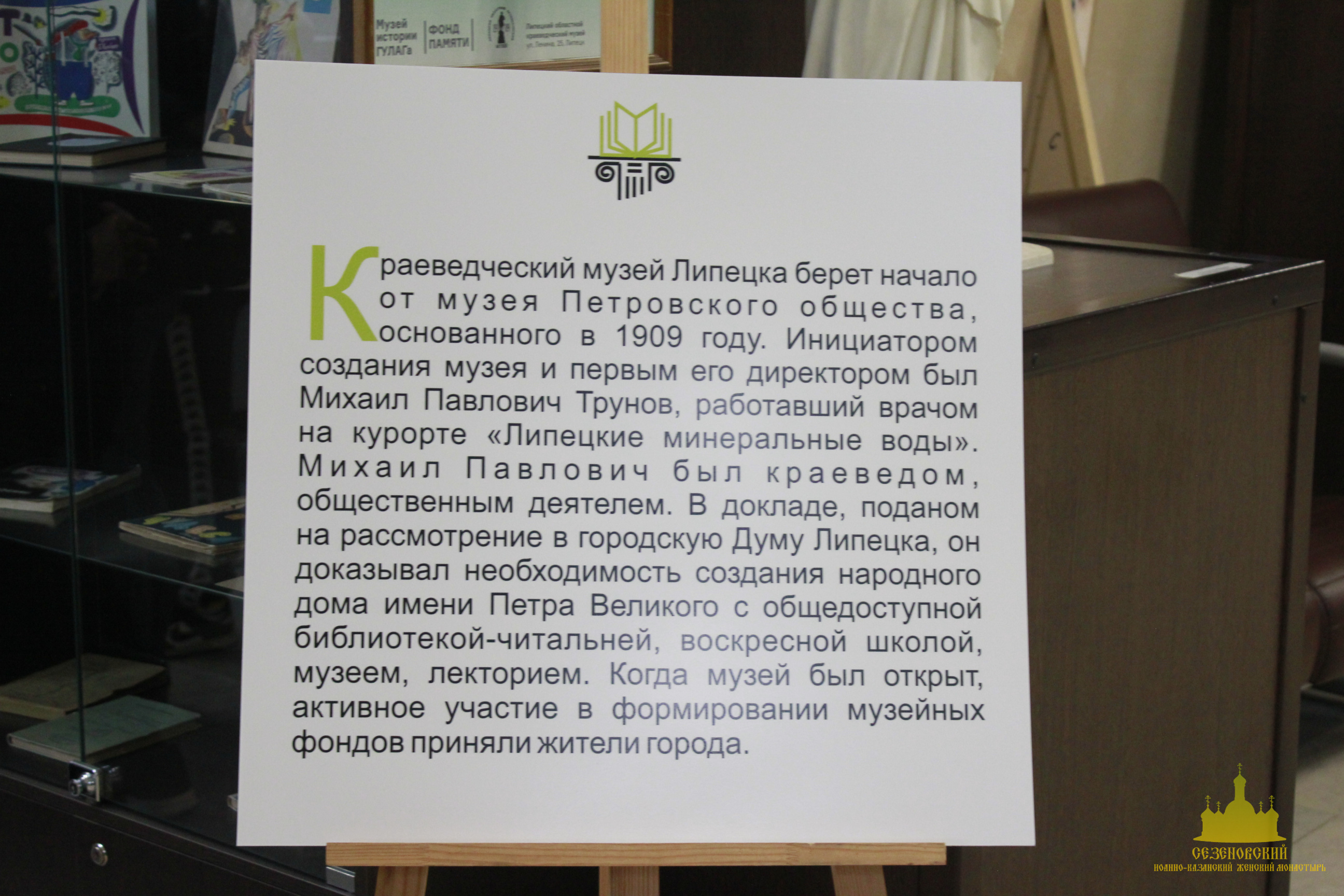 21 апреля 2023 г настоятельница Сезеновского Иоанно-Казанского епархиального женского монастыря игумения Феофания (Проценко) и сестры обители посетили областной краеведческий музей города Липецка, где экспонируется выставка «Из истории Липецкой и Елецкой епархий». Данная выставка – совместный проект Липецкого областного краеведческого музея и Комиссии по канонизации святых Липецкой митрополии, посвященная 20-летию Липецкой и Елецкой епархии.