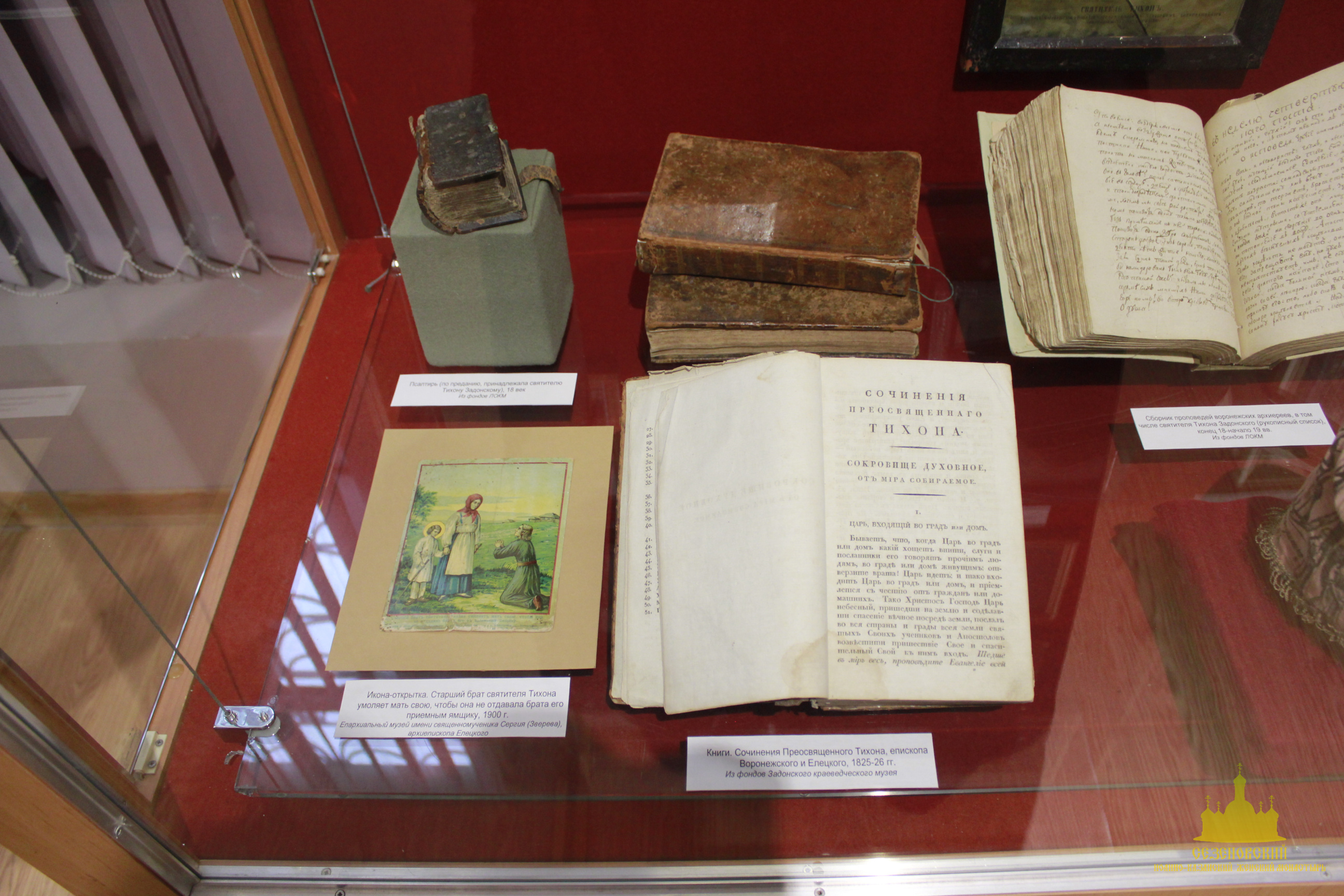 Среди этих экспонатов находится маленькая «Псалтирь», изданная в XVIII веке, на форзаце которой чернилами сделана надпись «Сей Псалтырь, предание утверждает, что он был Св. Тихона Задонского. Печатан при Екатерине Великой», последнее слово взято в скобки, ниже приписано синим карандашом: «при Екатерине первой». Как рассказала Анжелика Владиславовна, именно такая «Псалтирь» упоминается в воспоминаниях келейников святителя Тихона. Его келейник Василий Чеботарев писал: «Никуда и никогда не ходил и не езжал он без Псалтири, но всегда при себе имел оную за пазухою, ибо она была маленькая … Дорогою, куда отъезжал, он всегда читал Псалтирь». Сотрудник музея добавила, что «Псалтирь» передали в музей дочери последнего настоятеля Липецкой Древне-Успенской церкви отца Стефана Востокова, который был репрессирован и расстрелян в 1937 году. По ее словам, многие из экспонатов выставлены впервые.