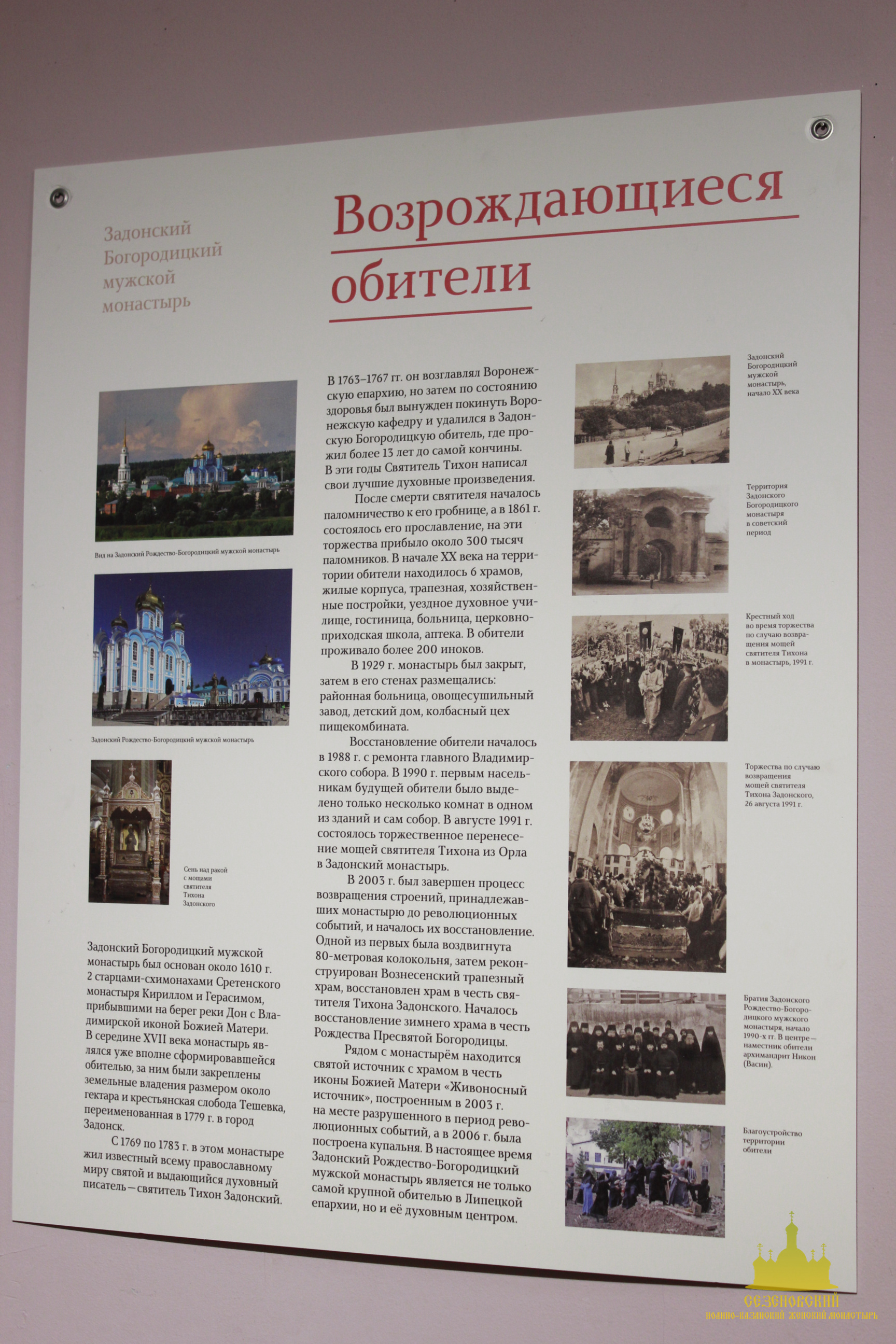 Вторая часть выставки посвящена современной истории Липецкой и Елецкой епархий. На стенах зала размещены планшеты с информацией о восстановлении порушенных и образовании новых монастырей, возрожденных и новых храмах, Соборе Липецких святых, памятниках святым, установленных в Липецкой области.