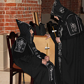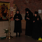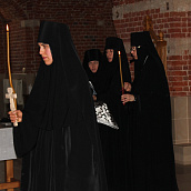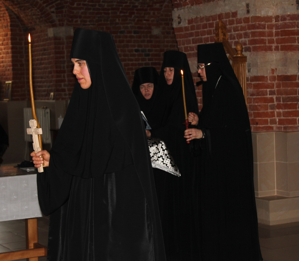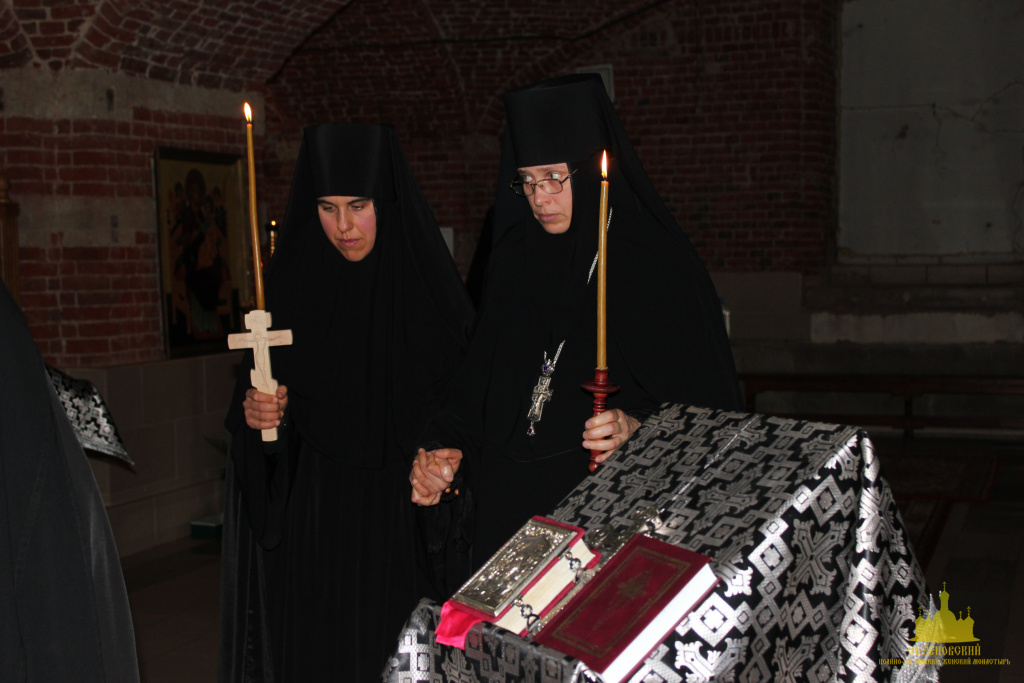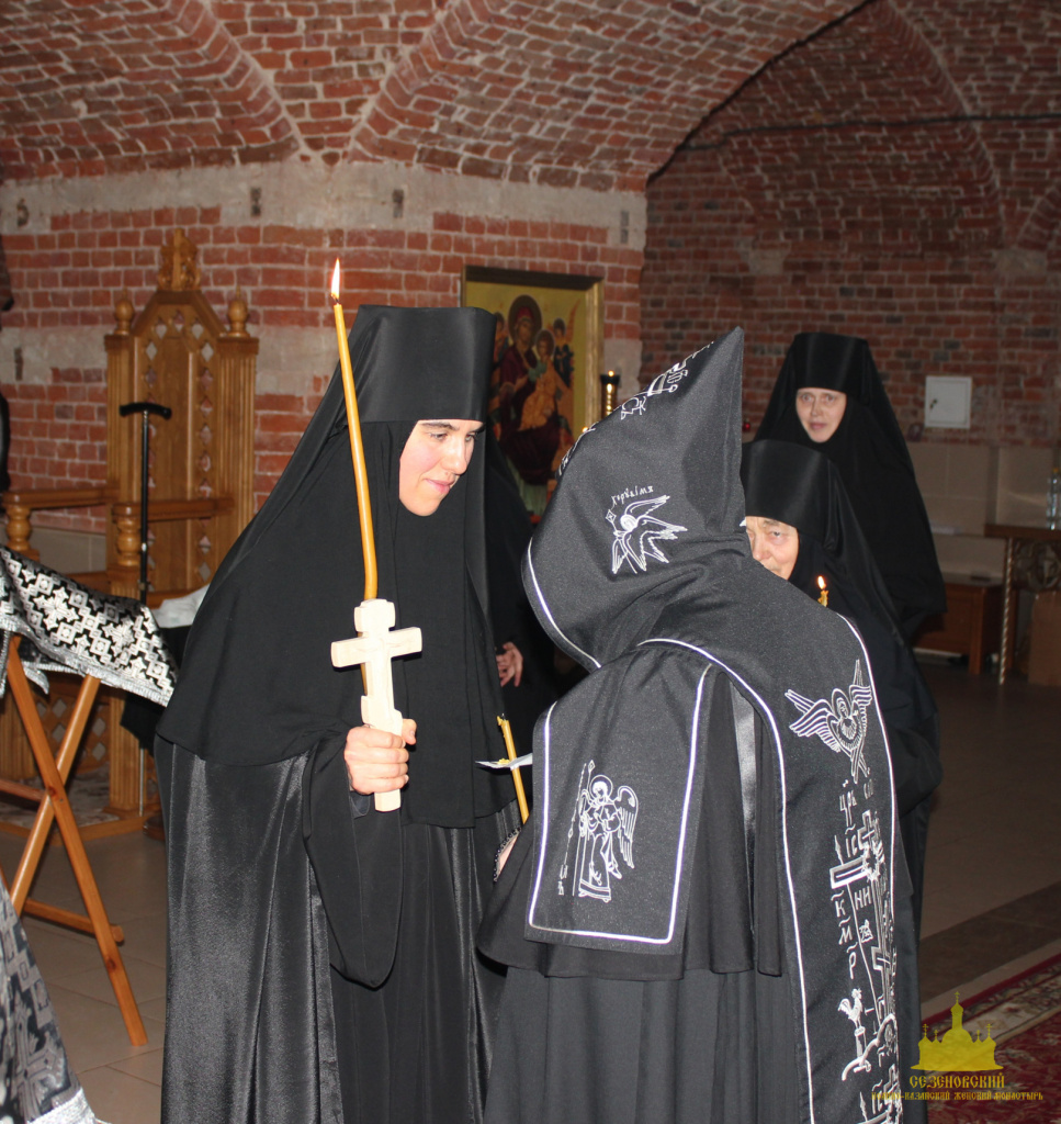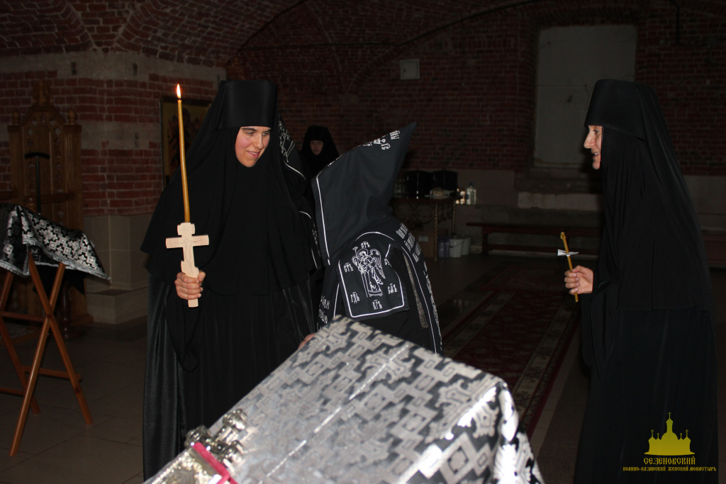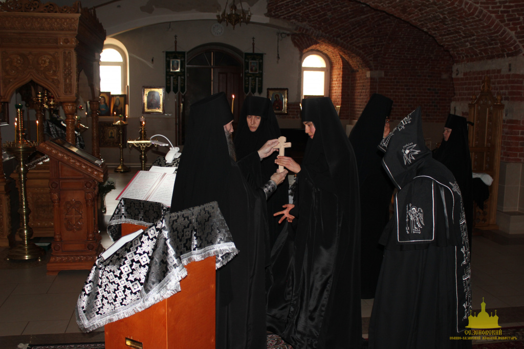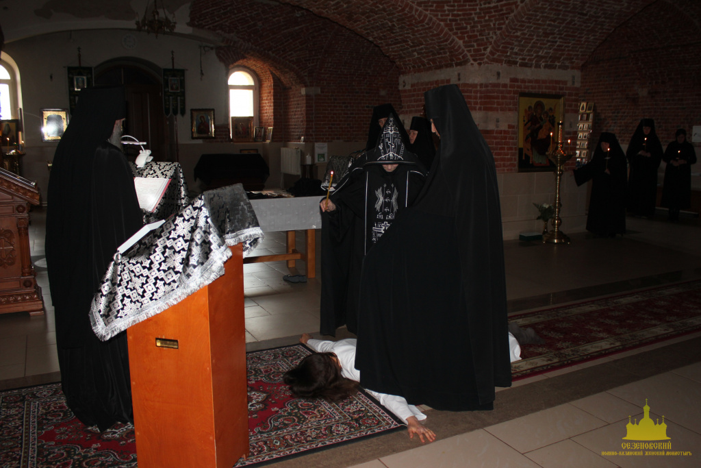 «Объятия Отча отверсти ми потщися, блудно мое иждих житие…» - тихо и умилительно поют сестры тропарь, трогая до глубины души всех молящихся в этом момент в храме, пока постригаемая сестра в длинной белой срачице, окруженная старшими монахинями, проползает к Алтарю, к «сим любезным объятиям» Отца Небесного. Процессия останавливается у амвона, где постригаемая сестра лежит ниц с распростёртыми крестообразно руками.