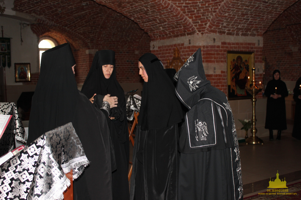 В конце чина пострига все сестры монастыря поздравляя новопостриженную, поочередно троекратно лобызались с ней, вопрошая ее новое имя и желая ей «спасаться о Господе».