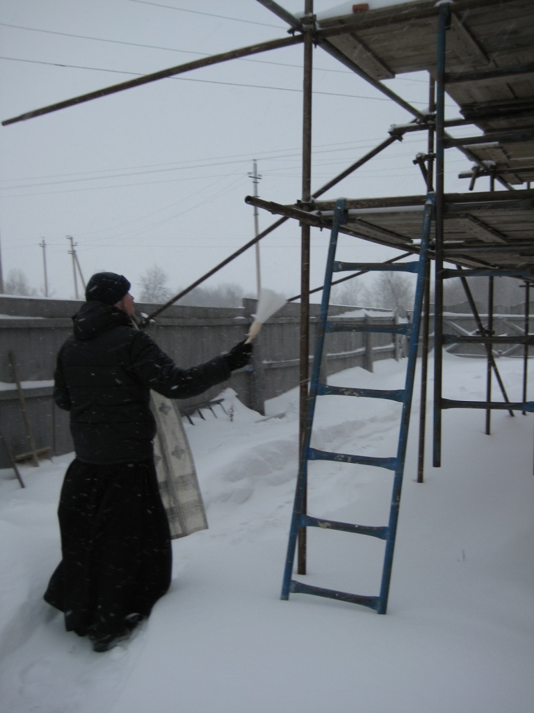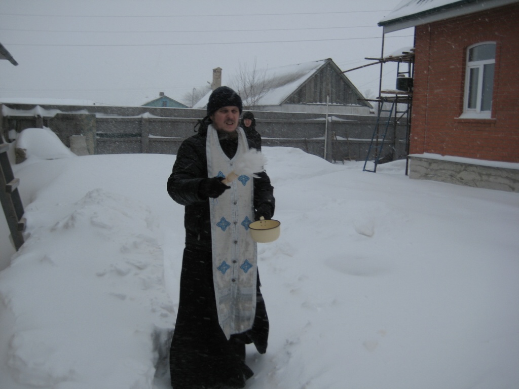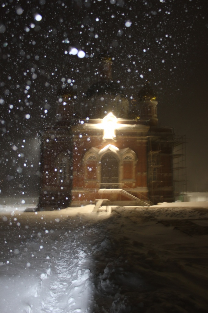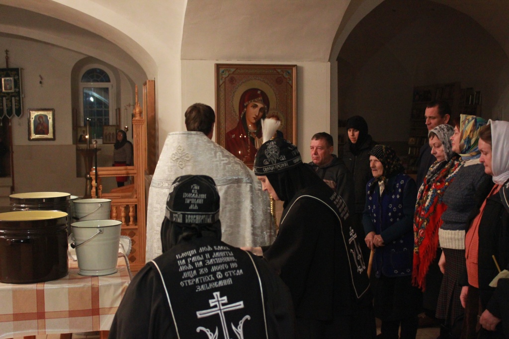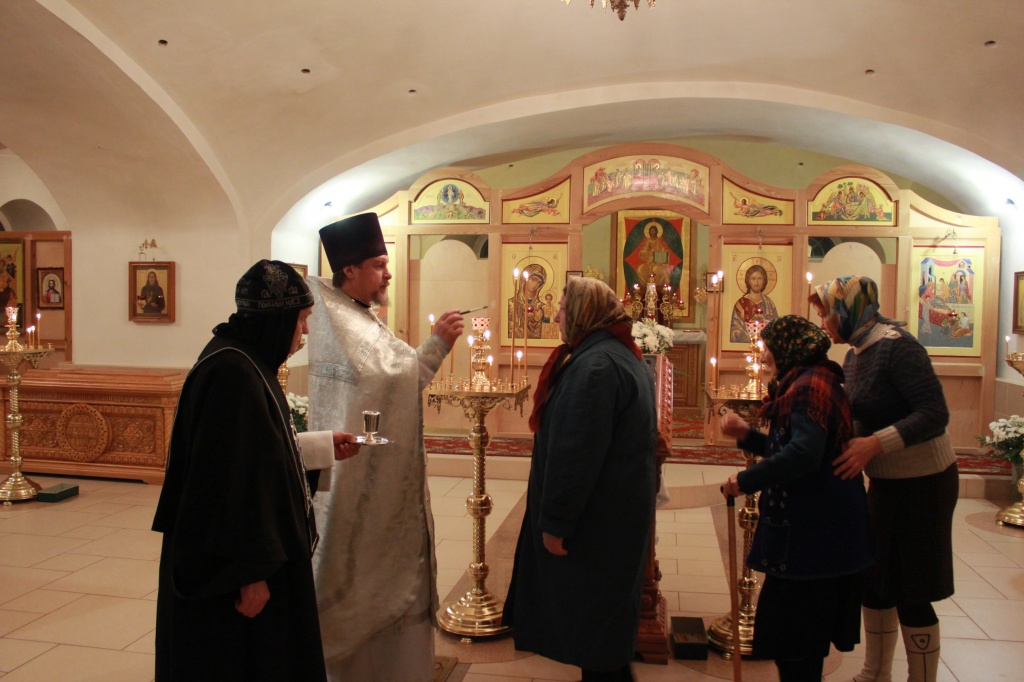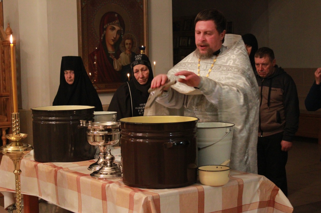 В полночь совершается праздничное богослужение. Из-за сильного снегопада и метели в этот году немногие смогли добраться до монастыря, но ничто не нарушило торжественности праздника. Умилительно звучали песнопения в исполнении монашеского хора. В конце богослужения было совершено Великое освящение воды, святой водой был окроплен храм и все прихожане.