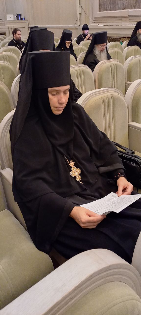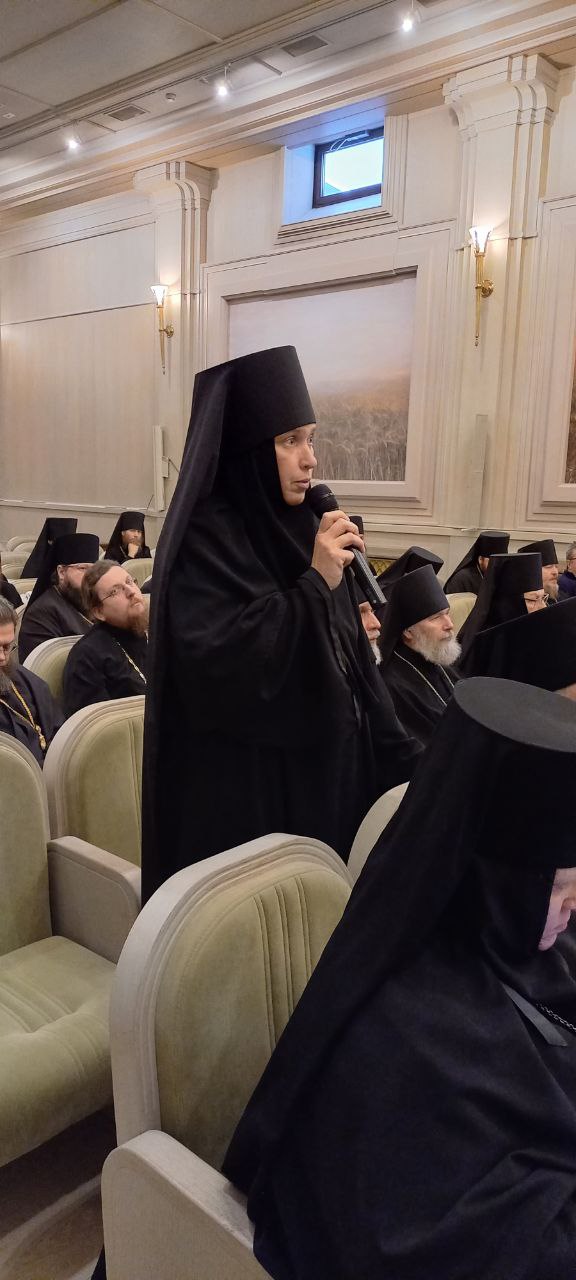 Завершающим на собрании стало выступление игумении Анны (Морозовой), настоятельницы Свято-Николаевского женского монастыря Донецкой епархии, в котором матушка рассказала о том, как живет сегодня обитель, находясь в зоне военного конфликта. С 13 марта 2022 года монастырь подвергается массированным артиллерийским обстрелам. На сегодняшний момент в обители не осталось ни одного целого здания, повреждены кровли на всех монастырских строениях. Полностью разрушены все системы коммуникаций: нет электричества, воды, газа, тепла, связи. Оставшиеся в монастыре сестры живут в подвальных помещениях. Большая часть насельников проживает в нижнем храме, где ежедневно совершаются богослужения. Там же готовится пища на газовой плите. Для приготовления используется газовый баллон. Жизнедеятельность монастыря полностью зависит от генератора. Дорога к монастырю, по которой завозится дизельное топливо, постоянно обстреливается. Люди, рискуя жизнью, доставляют в обитель топливо, хлеб, продукты. Есть погибшие и раненые. Около пятидесяти монашествующих остаются в обители, ради того, чтобы совершалось богослужение, не угасали лампады. Остальные выехали из монастыря и проживают в монастырях и храмах, находящихся в более безопасной местности.