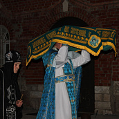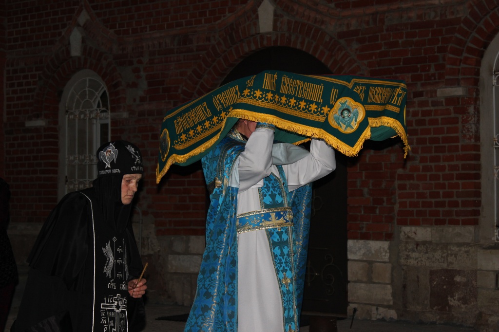 После чтения Евангелия и Великого славословия началось торжественное шествие верующих, сопровождавших Плащаницу Божией Матери вокруг собора с пением «Святый Боже, Святый крепкий, Святый бессмертный, помилуй нас».