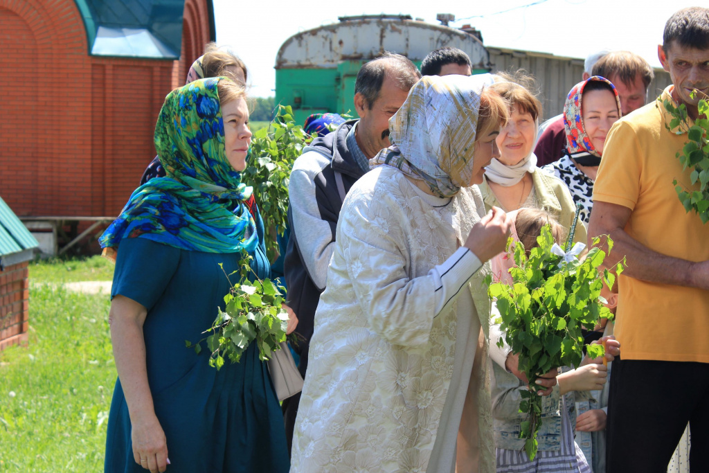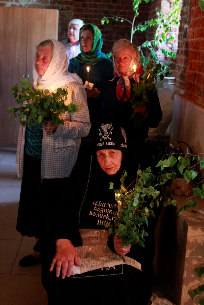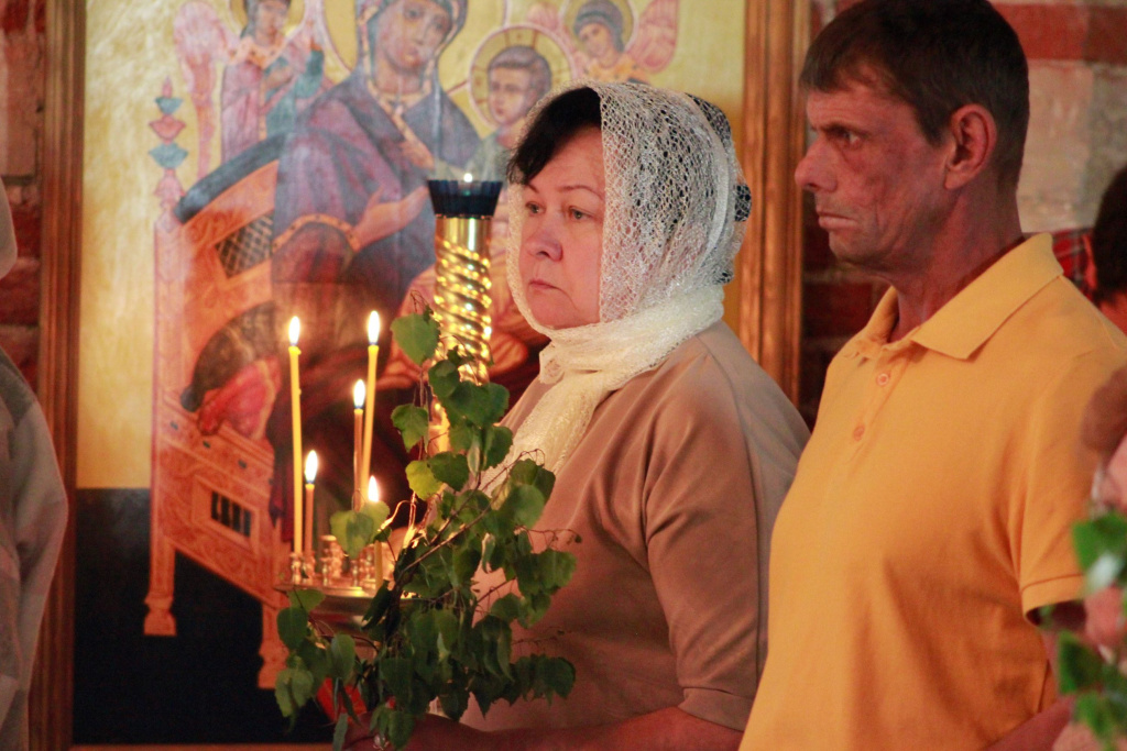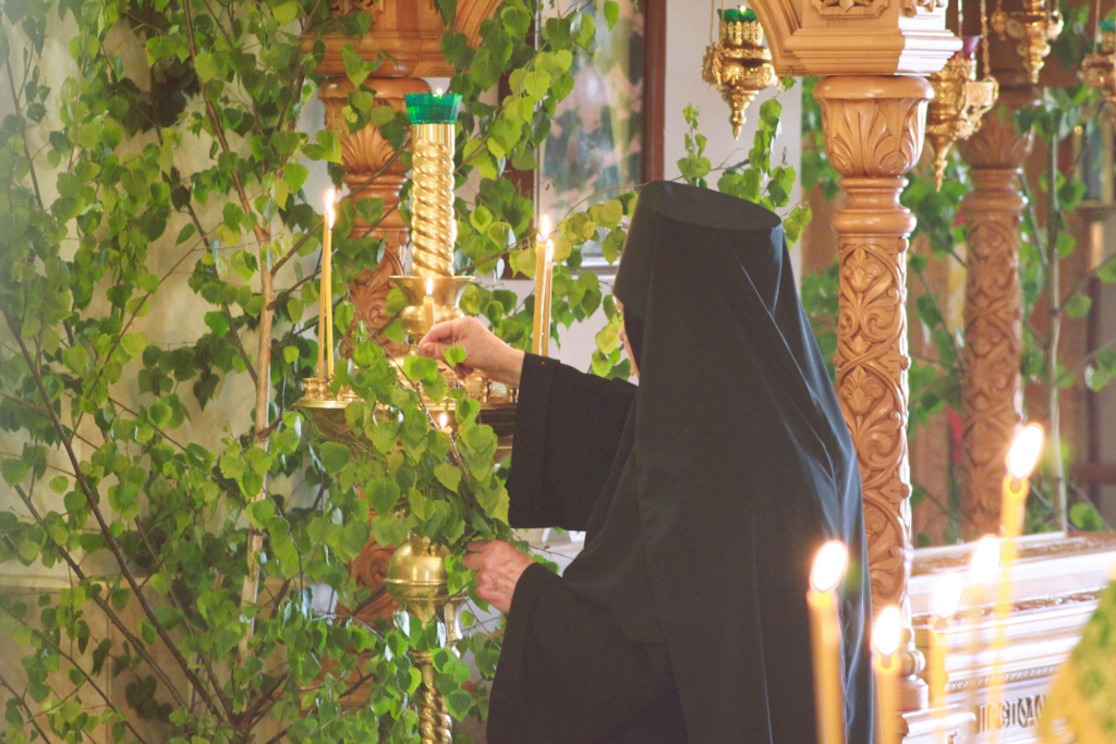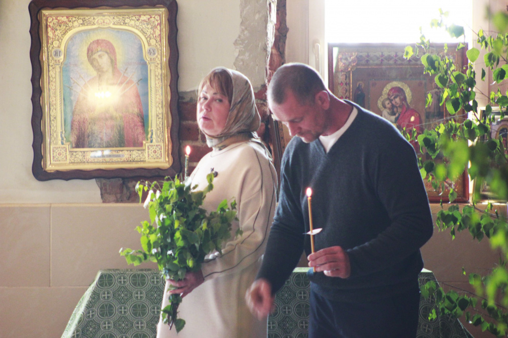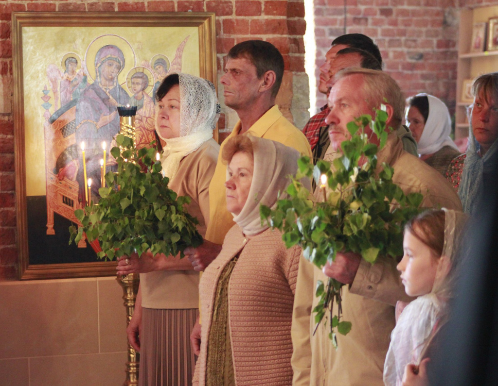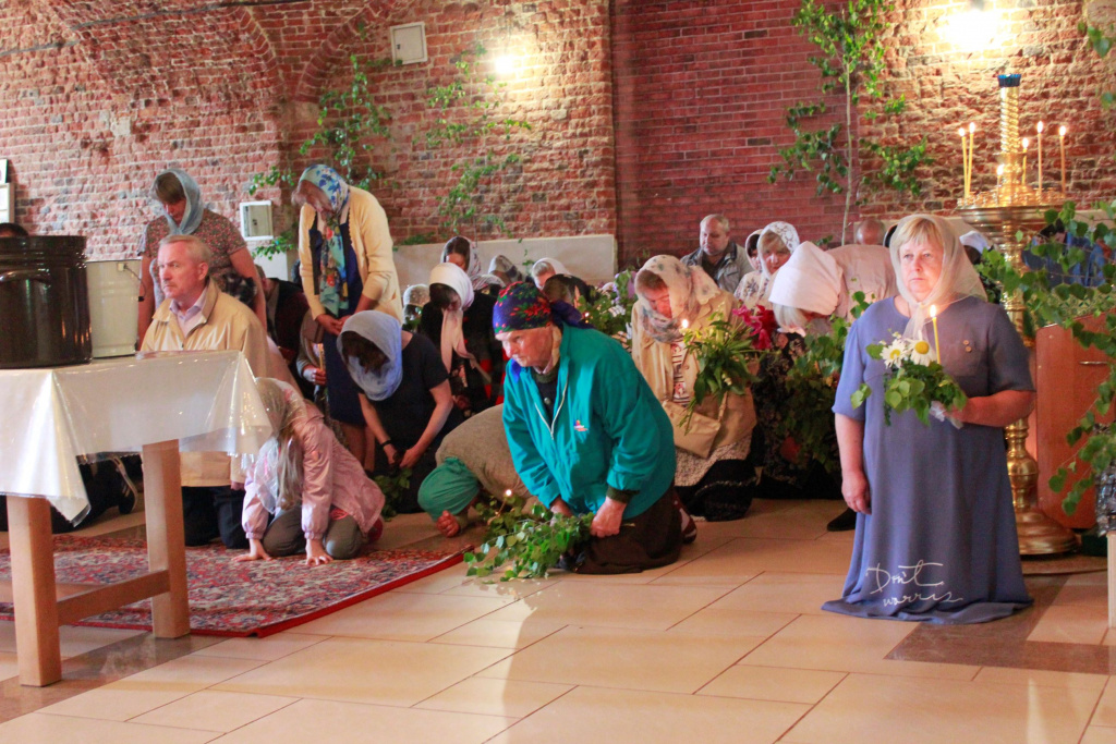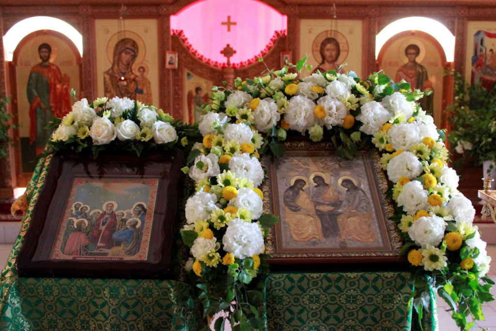 Литургия в праздник Святой Троицы необычайно живописна: храм украшен ароматной зеленью: травами, ветвями берез, на аналое украшенная цветами икона Святой Троицы, зеленые облачения священнослужителей, коленопреклоненные молитвы — все говорит верующим о великом замысле Божием, о победе Христа над смертью, о Царстве Божием.