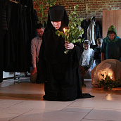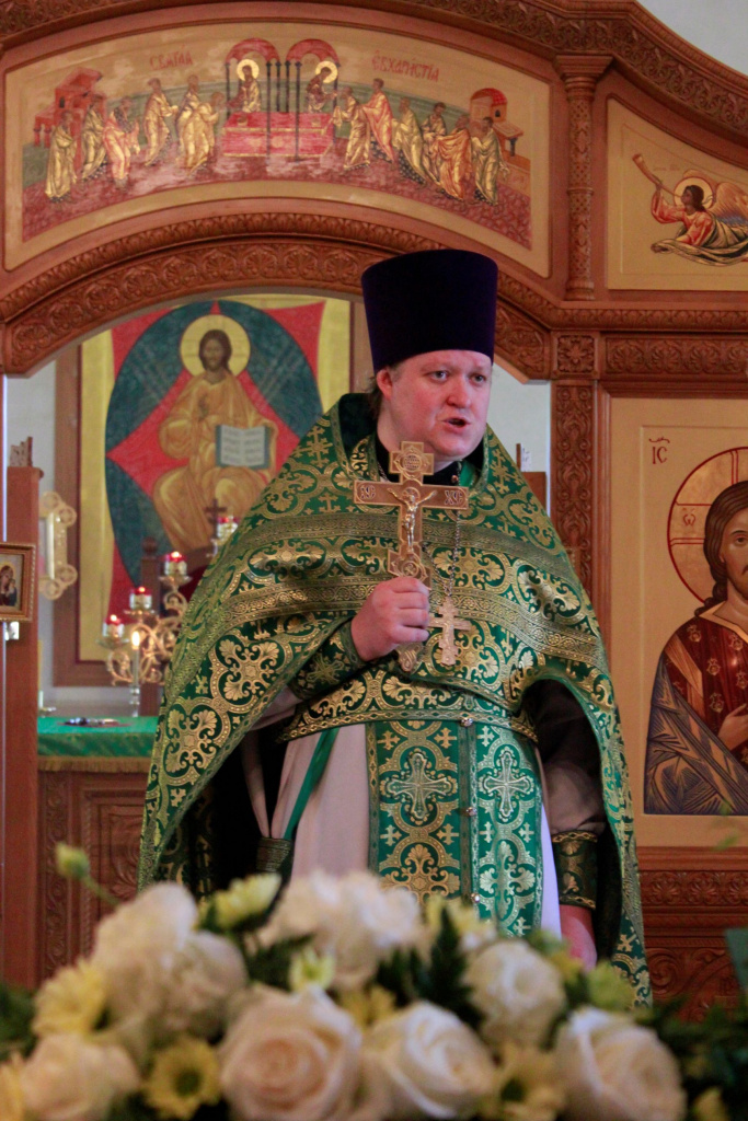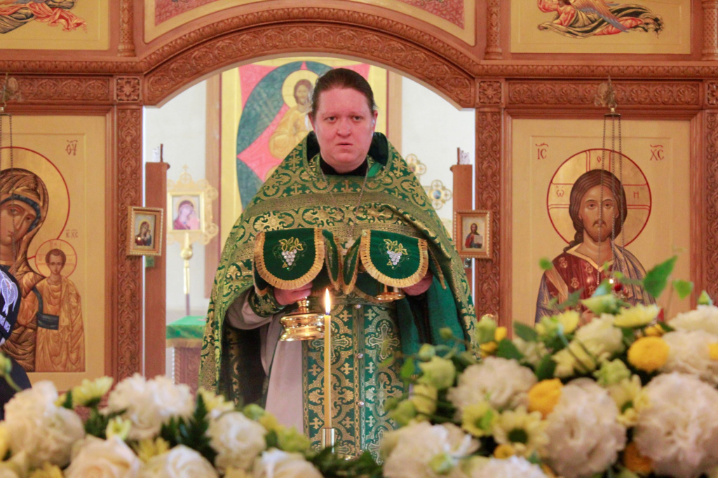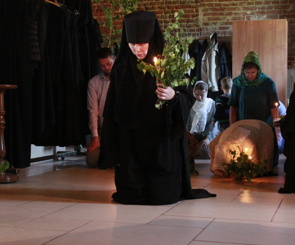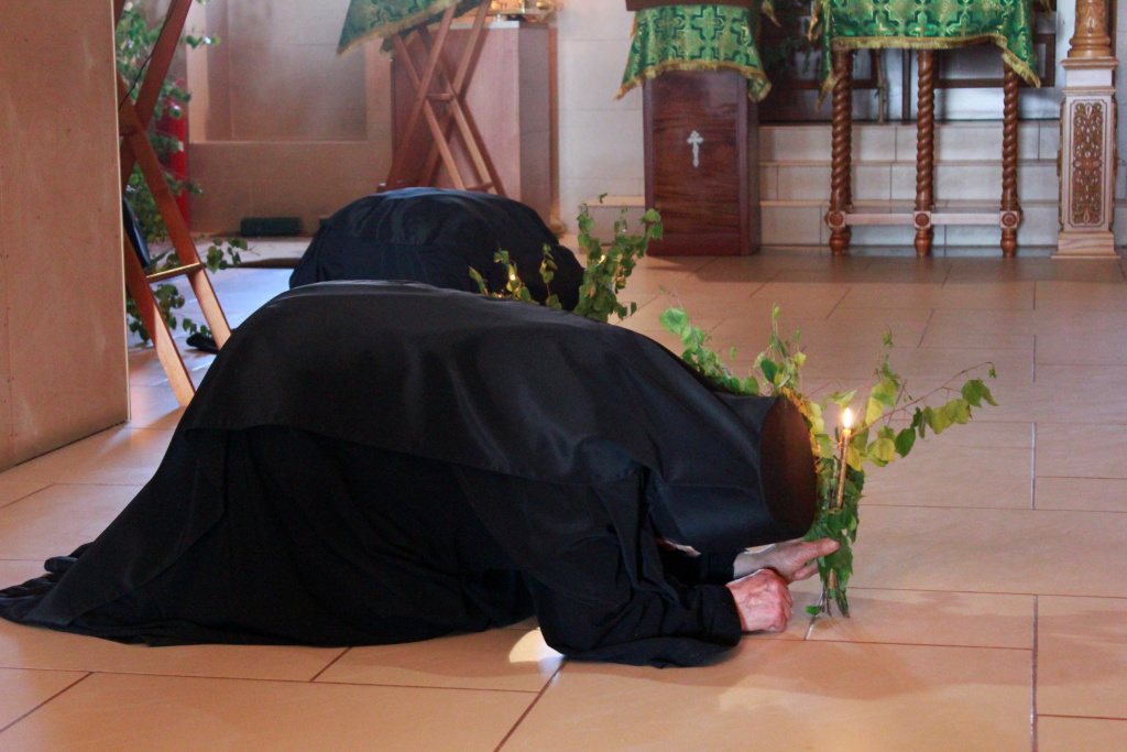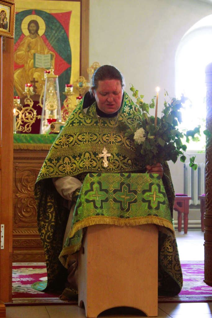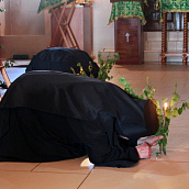 После Литургии была отслужена великая вечерня с чтением коленопреклоненных молитв. Эти молитвы, составленные святителем Василием Великим и читаемые священнослужителями только на вечерне в день Пятидесятницы, прежде всего, содержат в себе особые прошения о ниспослании верующим во Христа Святого Духа, Который есть Дух премудрости, разума и страха Божия.