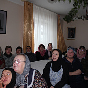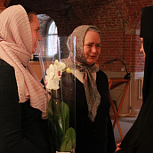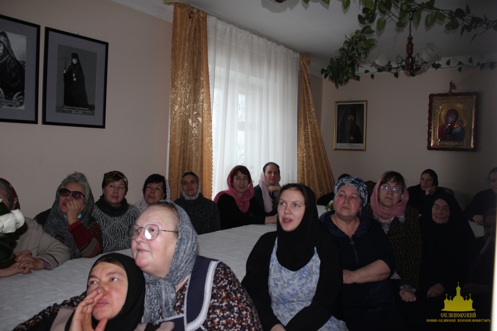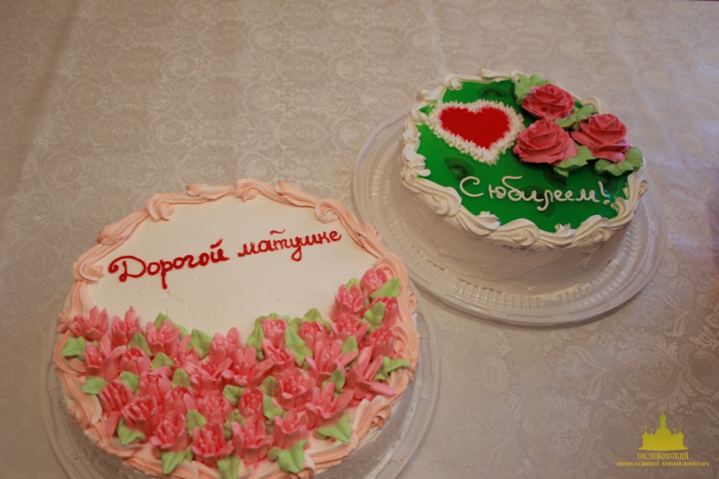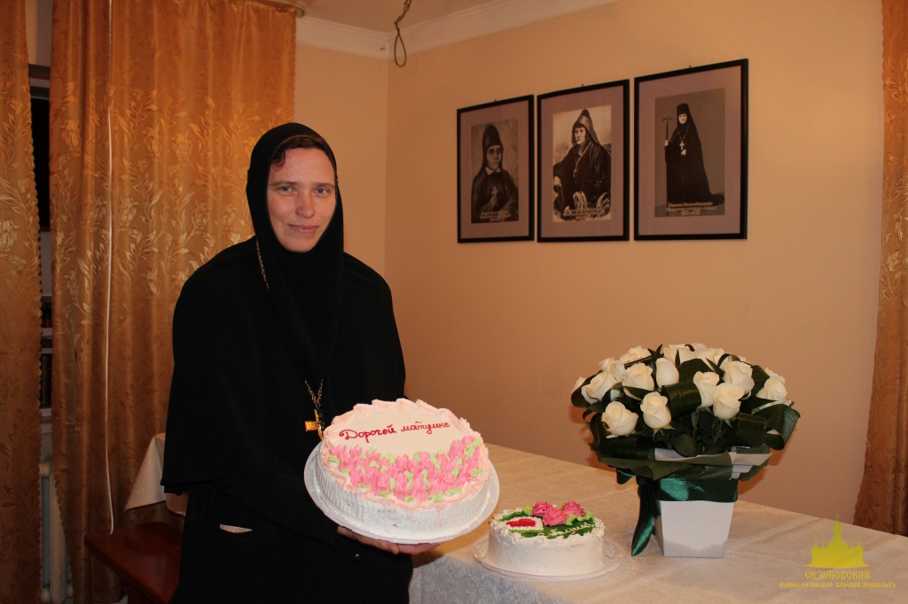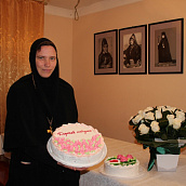 В заключение трапезы сестры монастыря благодарили свою Матушку за понесённые труды по возрождению духовной жизни обители, за любовь и материнскую заботу и подарили праздничный торт, приготовленный к ее юбилею. Всем гостям был предложен небольшой слайд-фильм о жизни обители от начала возрождения до наших дней.